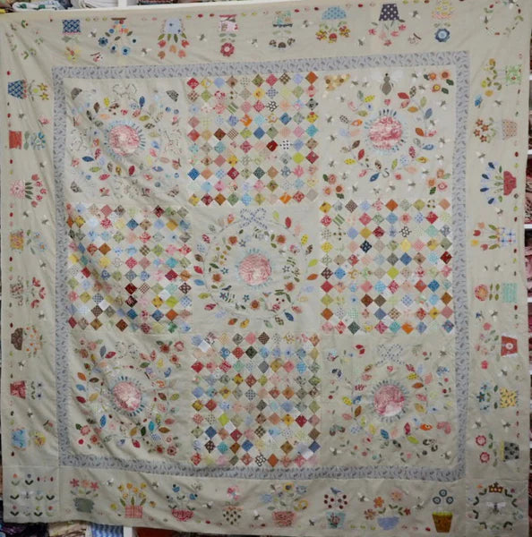This original design, nature inspired quilt has 5 large appliqué blocks, four pieced blocks and four borders all filled with flowers, bees, butterflies, ladybugs and flowers. It finishes at 76" square.