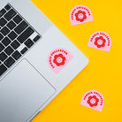 Add some fun to your space with our Fabric Collector Sticker. With an upside down smiley and vibrant red and pink daisy design, it's perfect for placement on any hard surface. This sticker is a must-have for any fabric enthusiast.