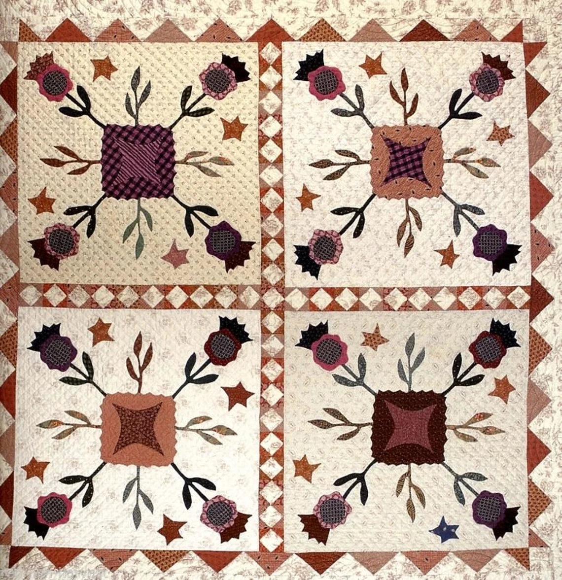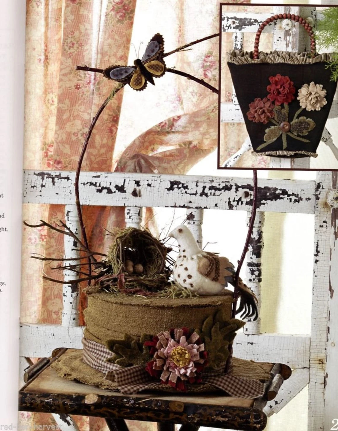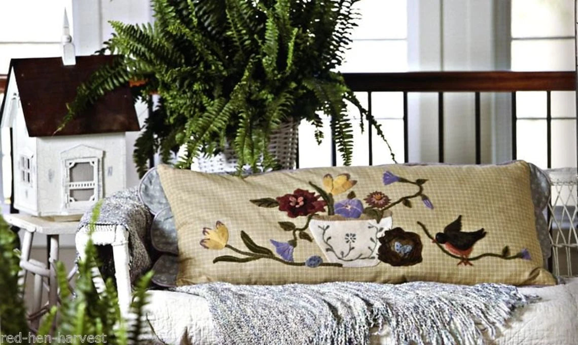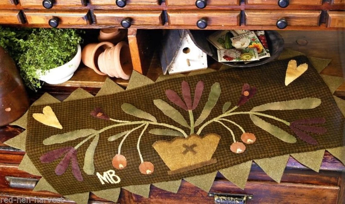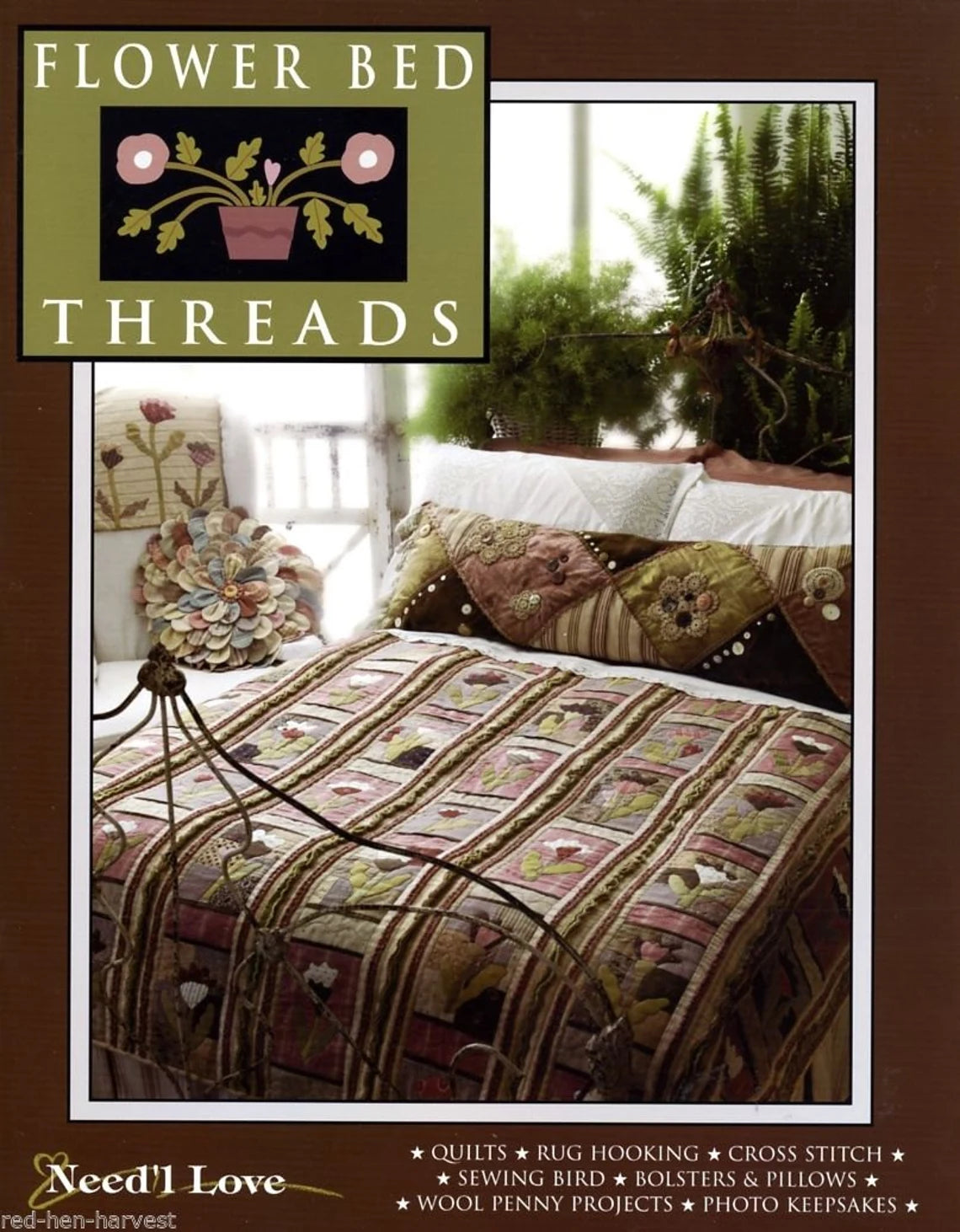 Flower Bed Threads contains 22 projects that use the following techniques... quilting, primitive rug hooking, applique, embroidery, and wool penny.