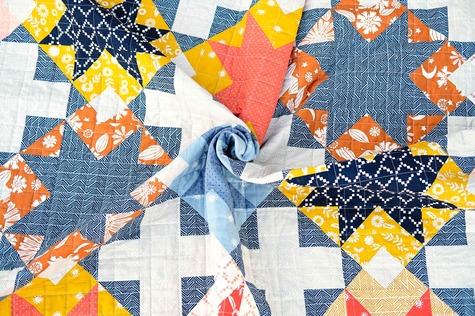 This quilt is a little twist on the traditional star block and a fun project for your favorite fabrics. The pattern has directions for three sizes: