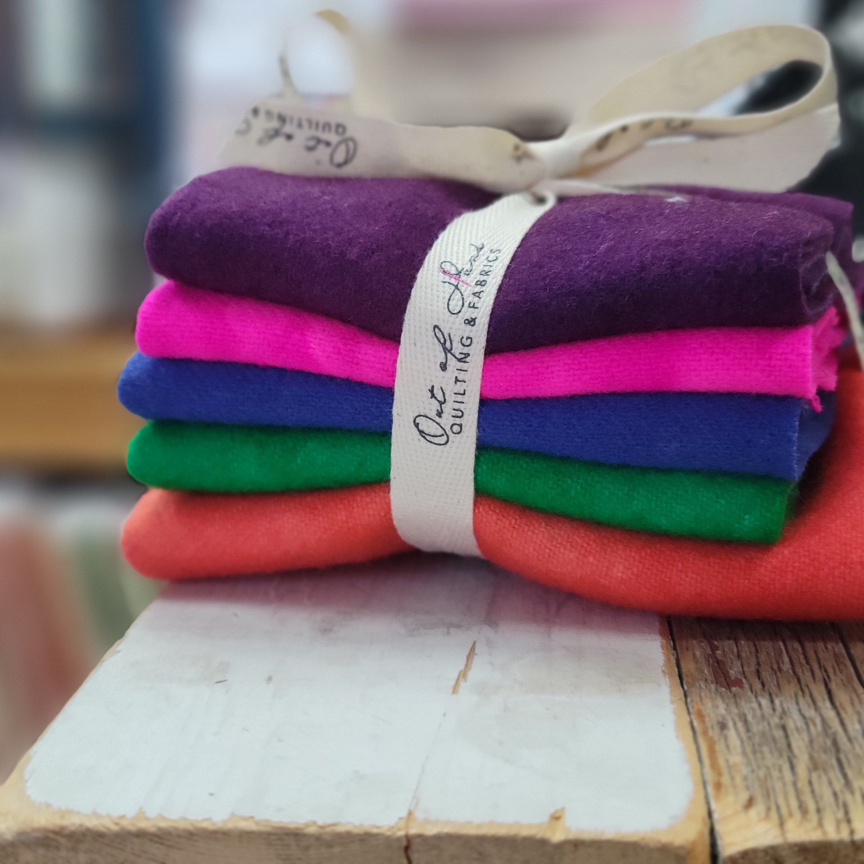 These bundles are ideal for stash building, with each bundle containing 5 pieces, shop cut at approx. 12"x7" (or cut as Fat 16ths). Due to the felted nature of textured and hand-dyed wools, some pieces may vary in size.