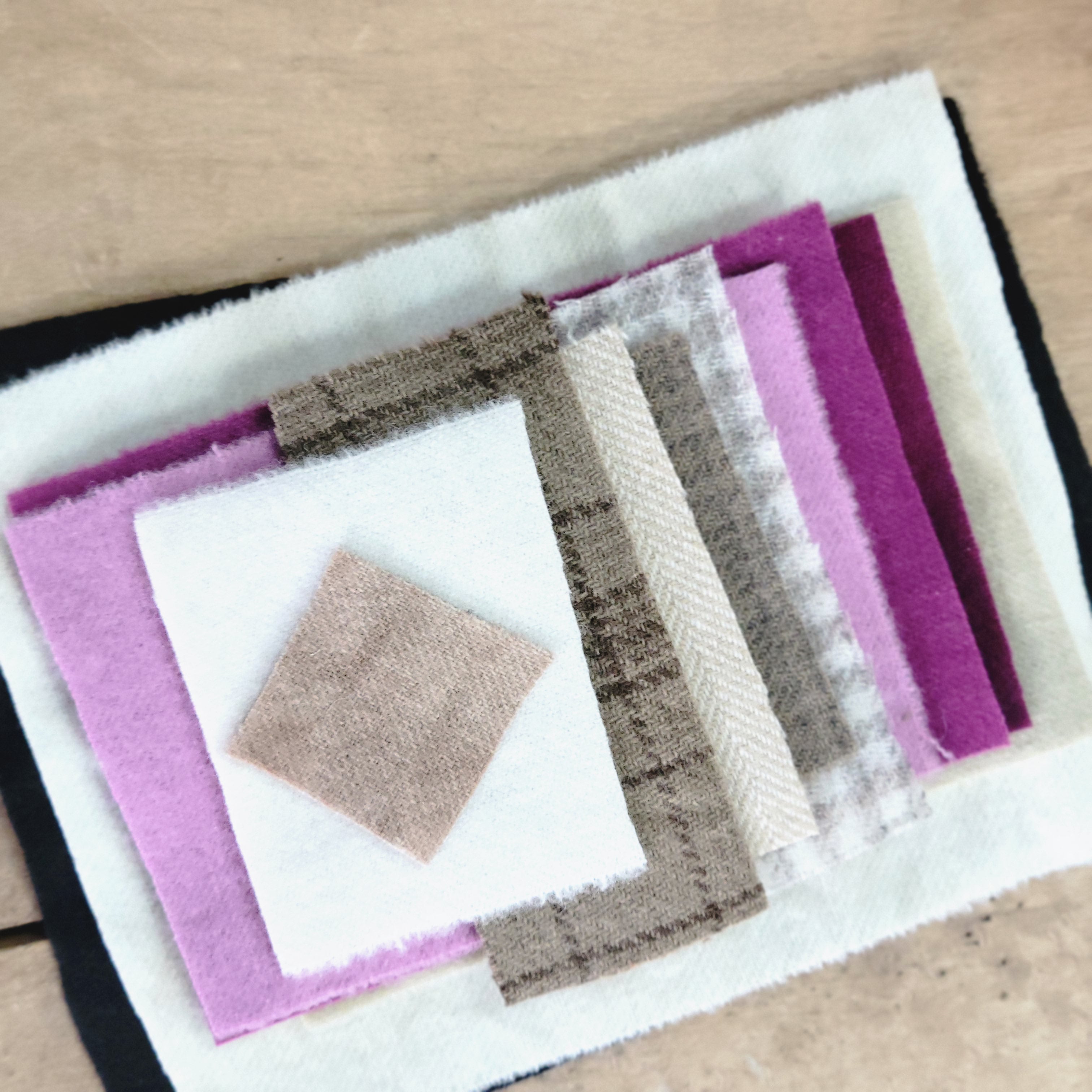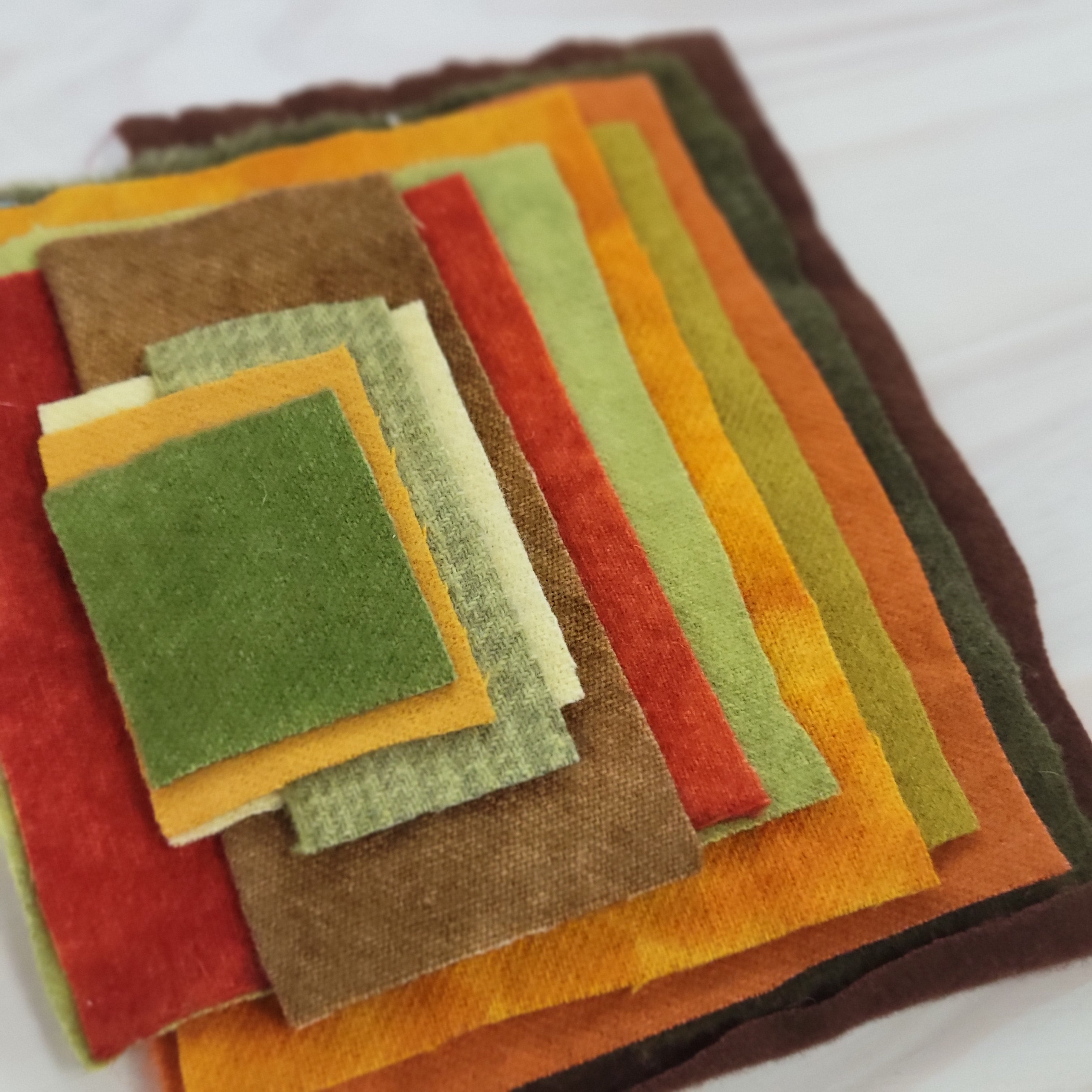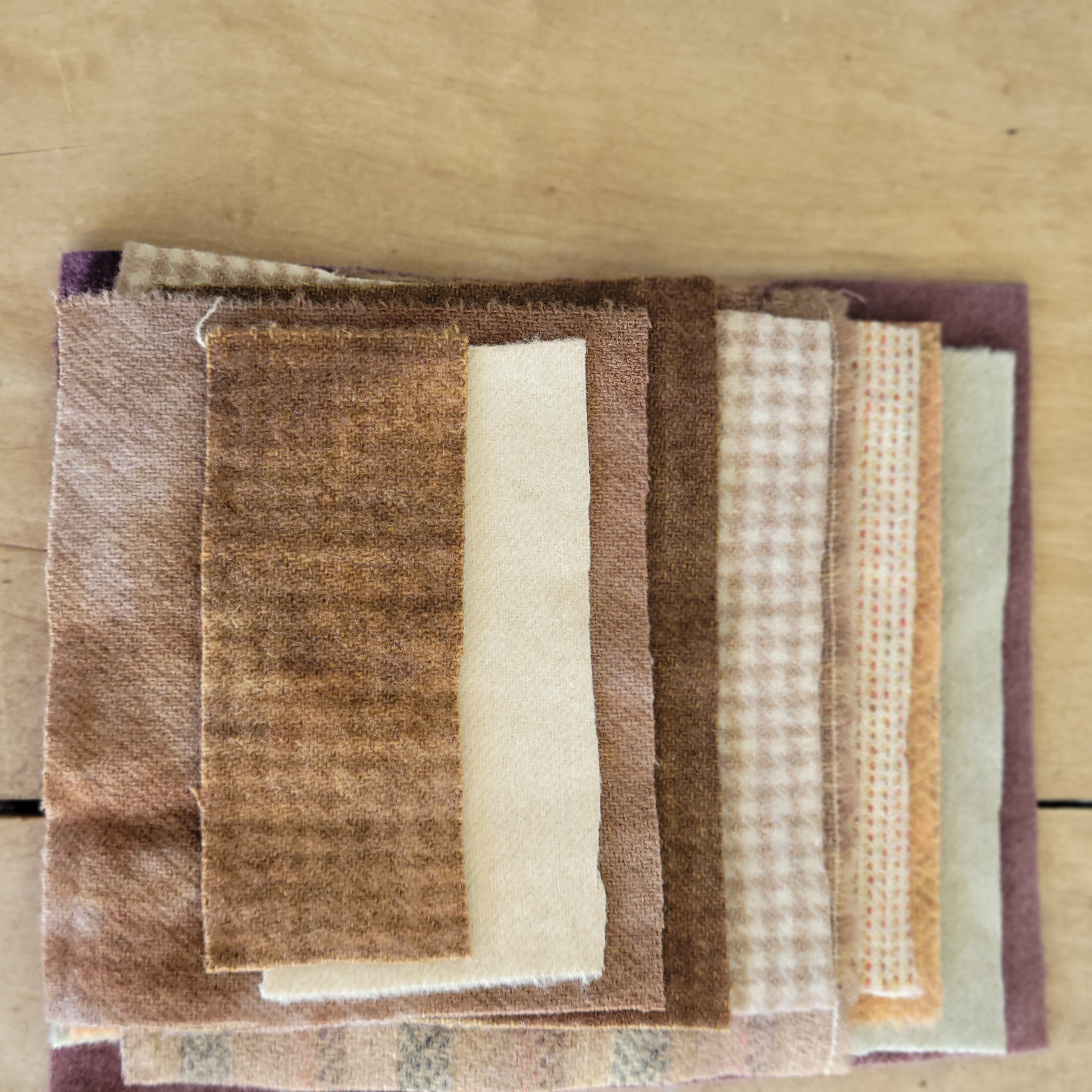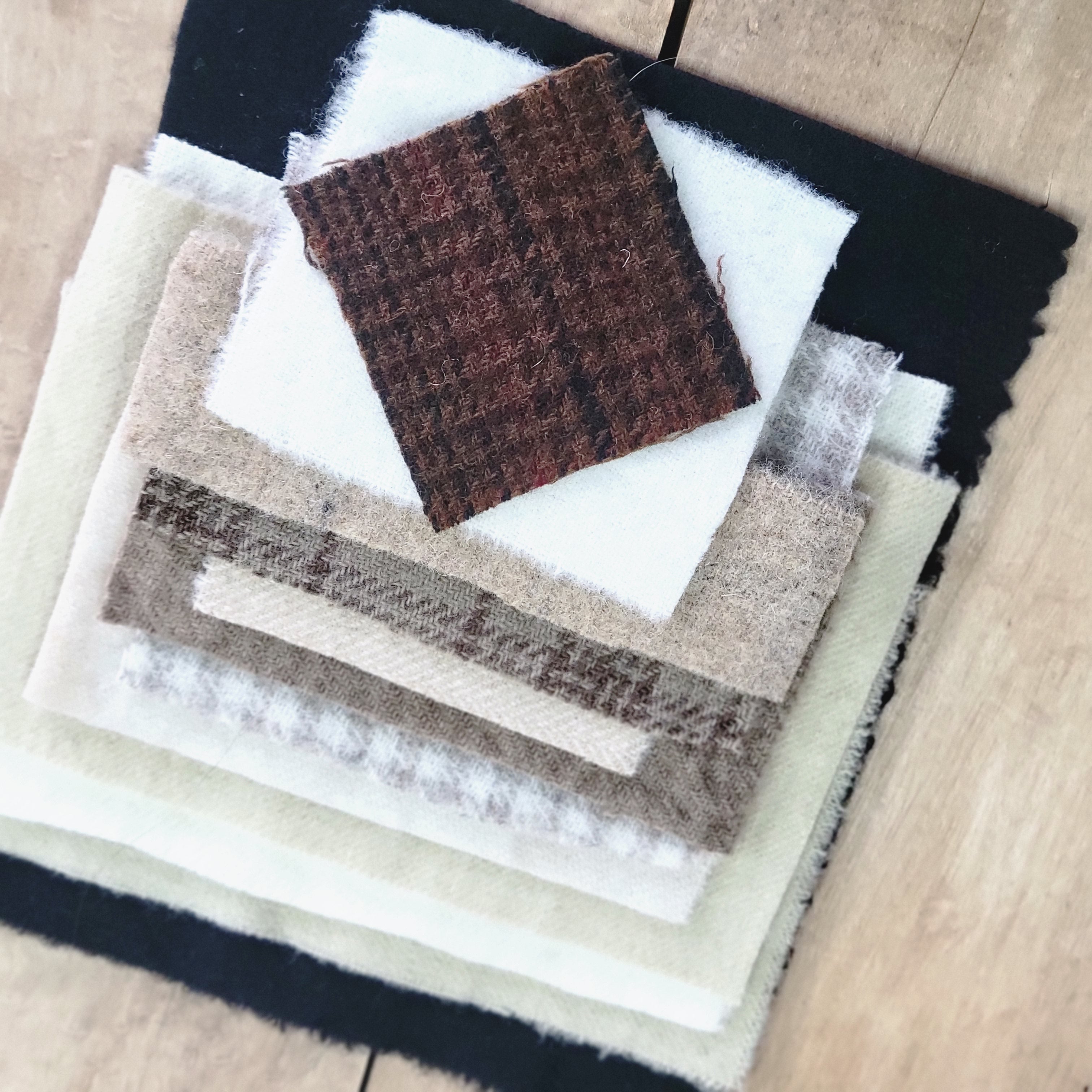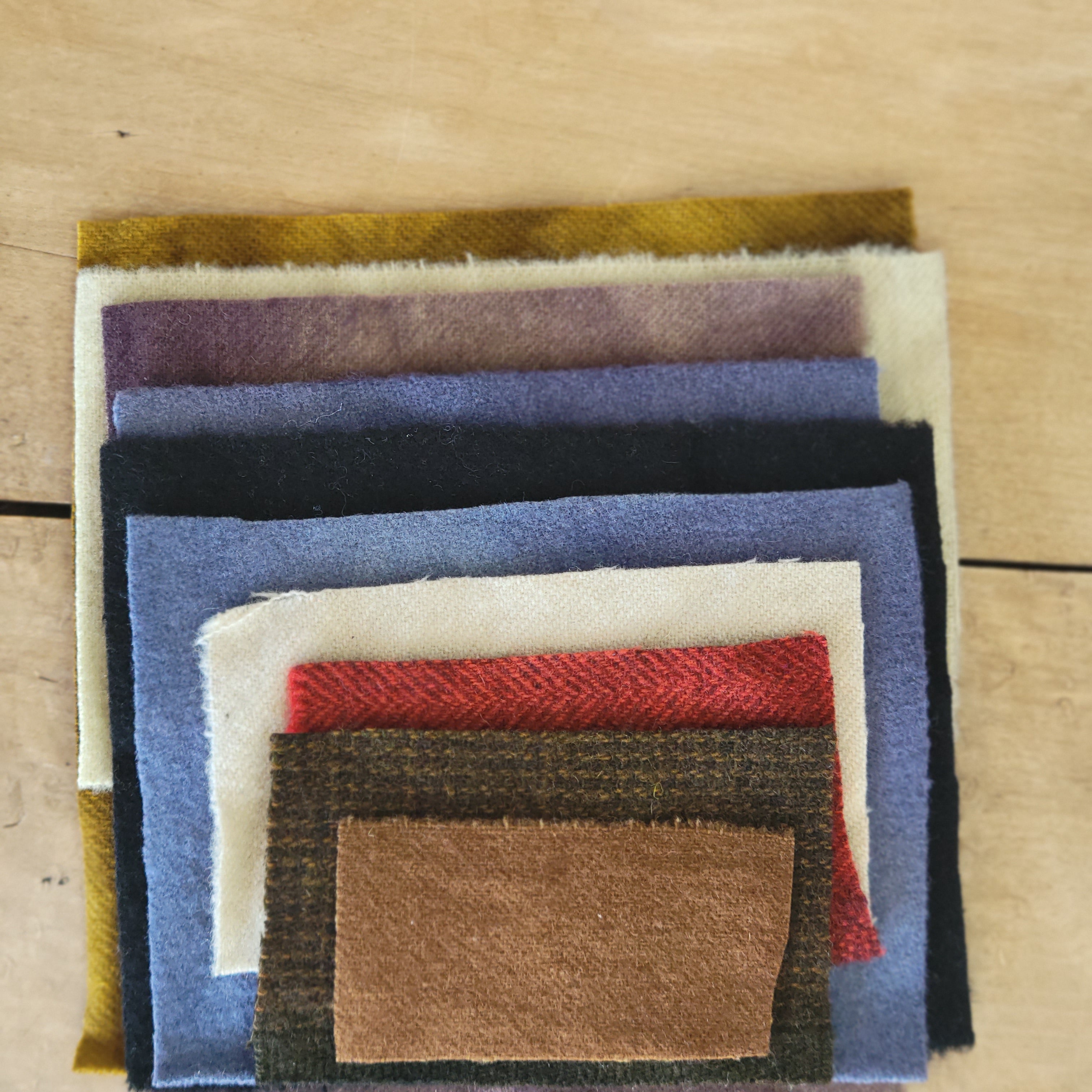 Each color co-ordinated package contains scraps of wool to equal the weight of one fat eighth, cut in a variety of sizes and paired with complimentary pieces.