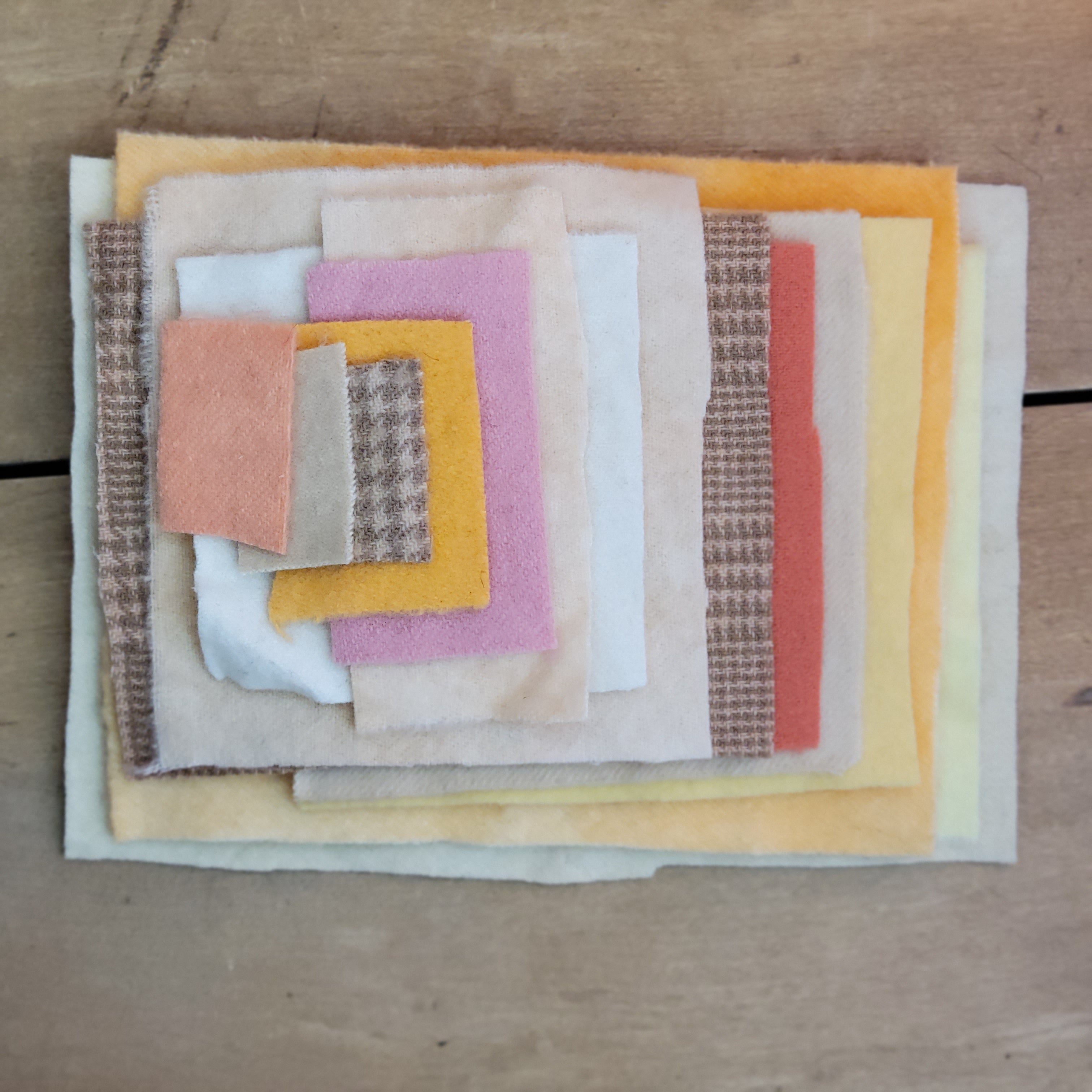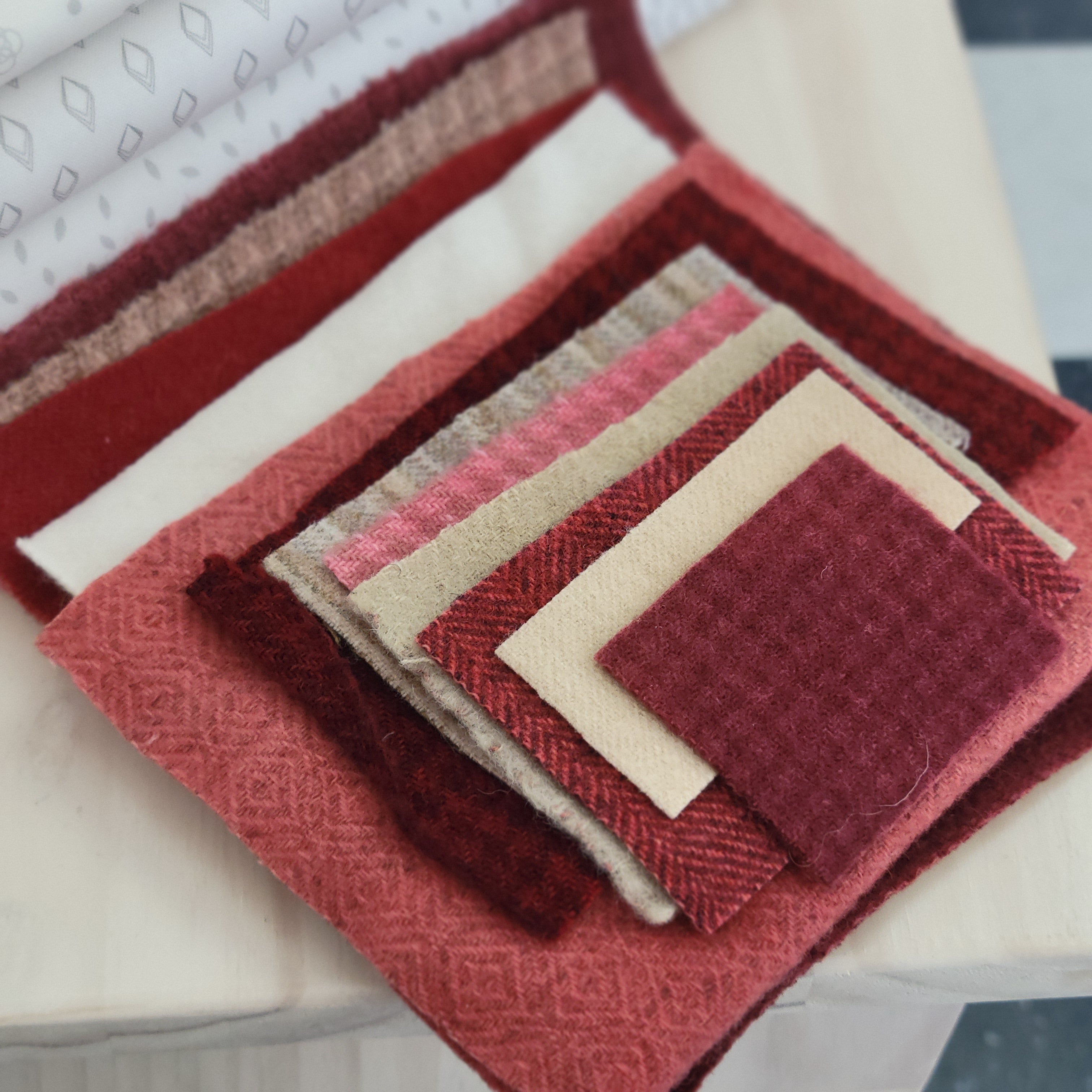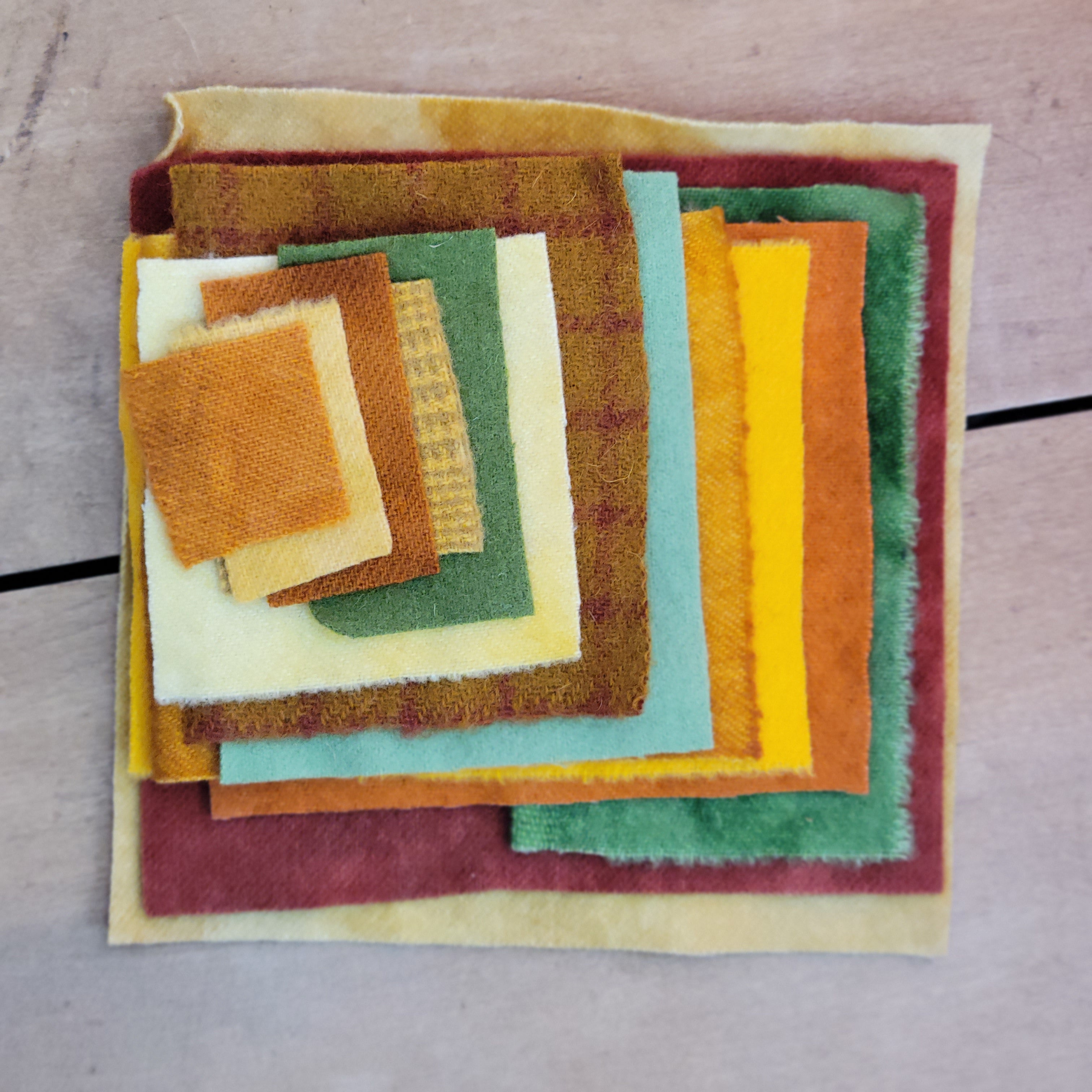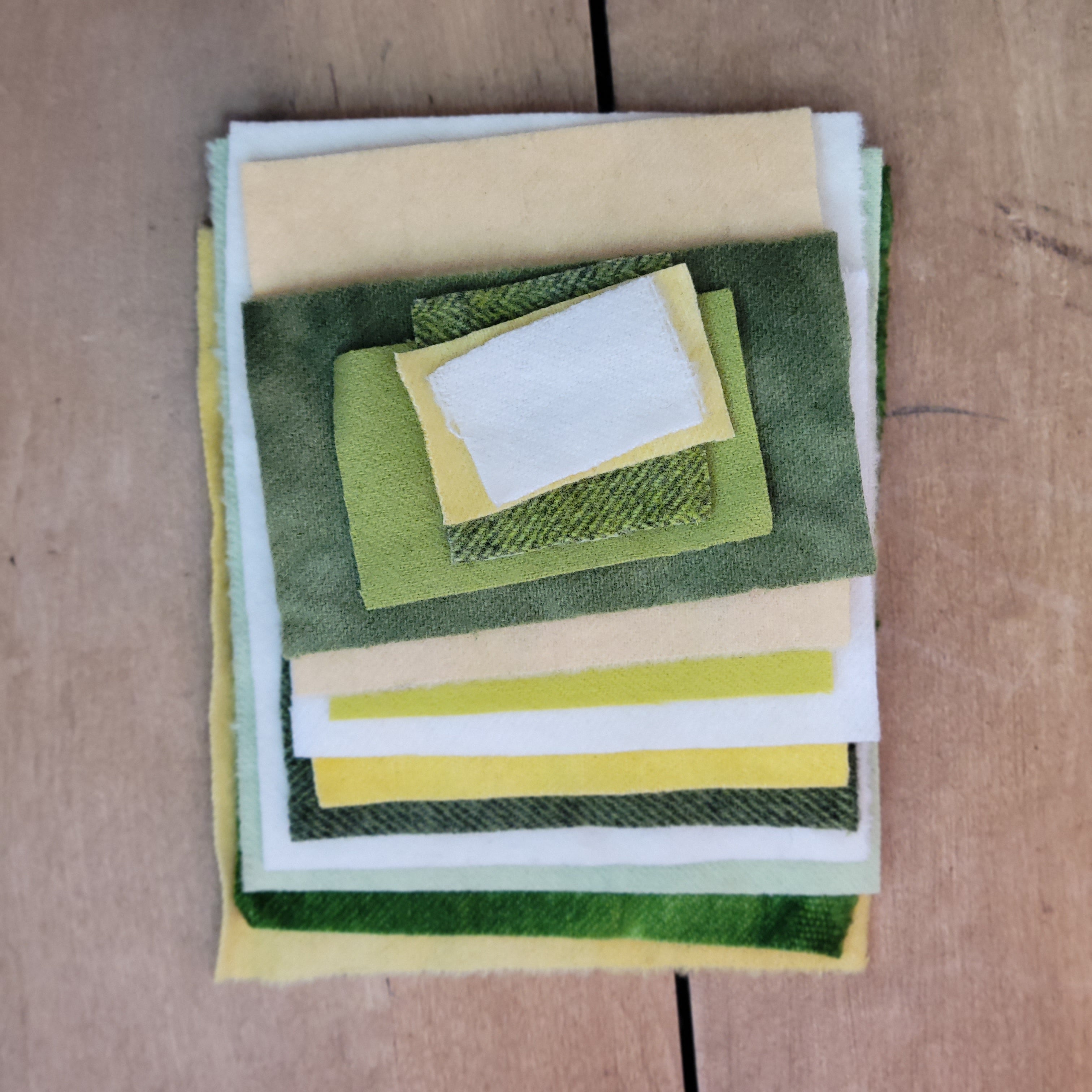 Each color co-ordinated package contains scraps of wool to equal the weight of one fat eighth, cut in a variety of sizes and paired with complimentary pieces.