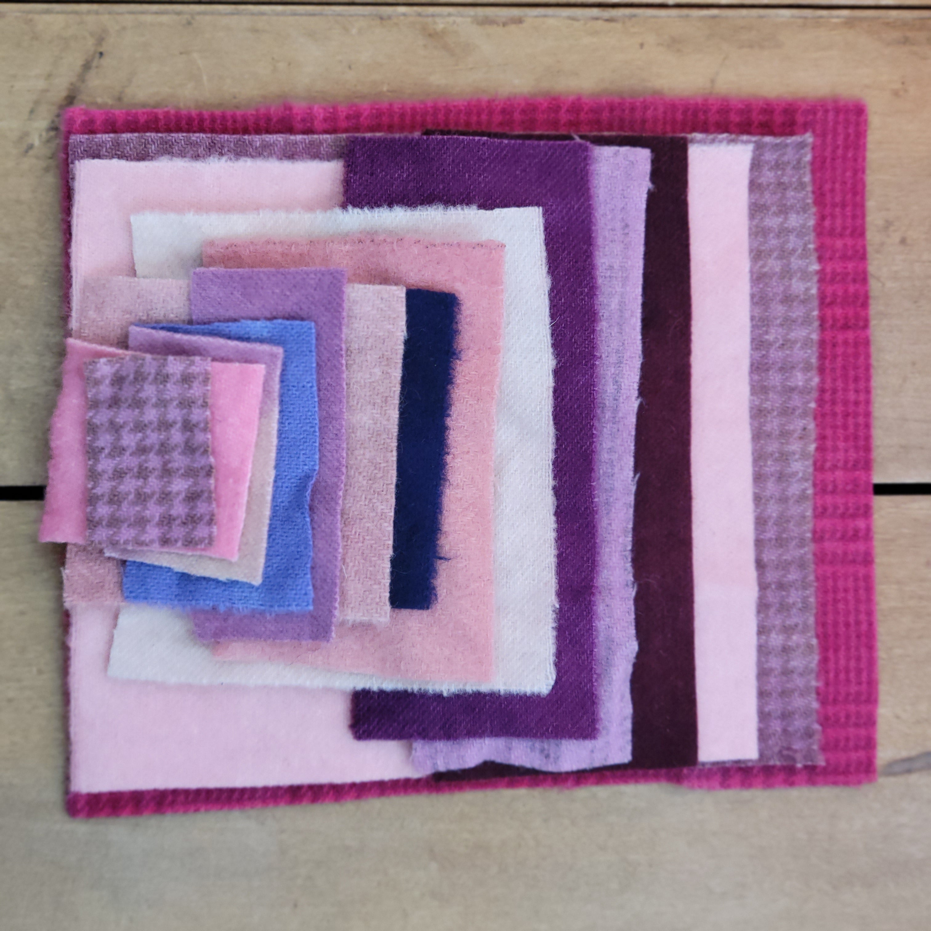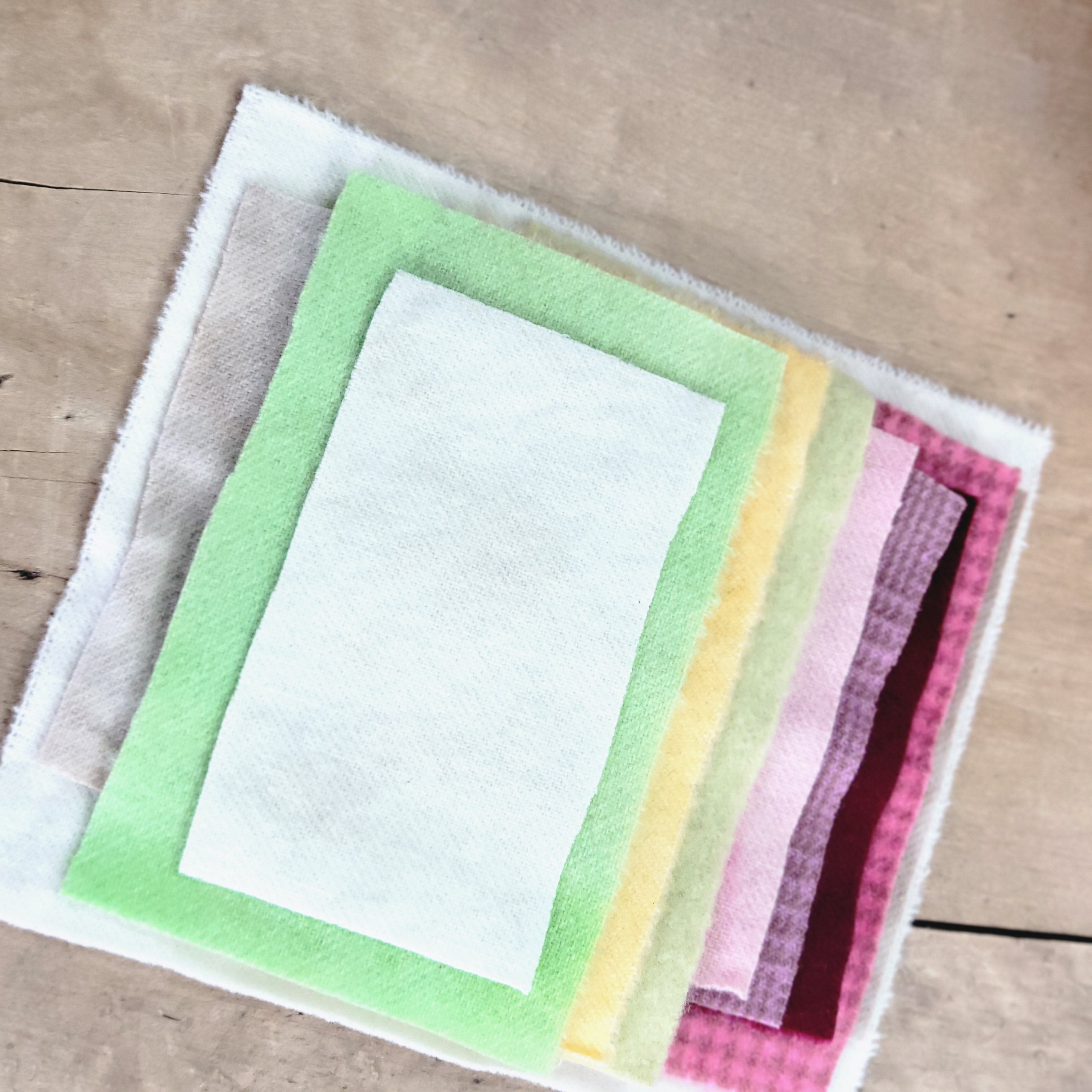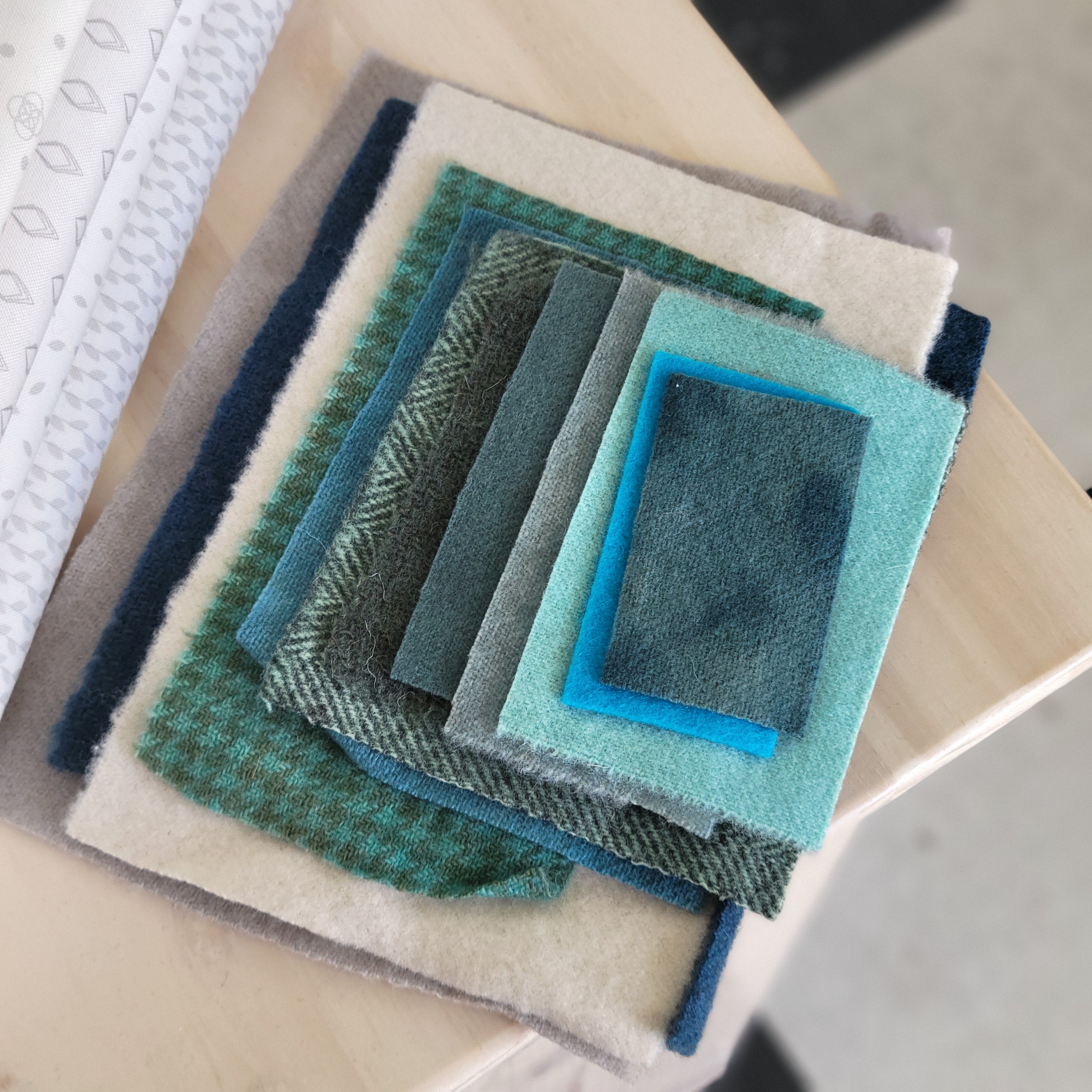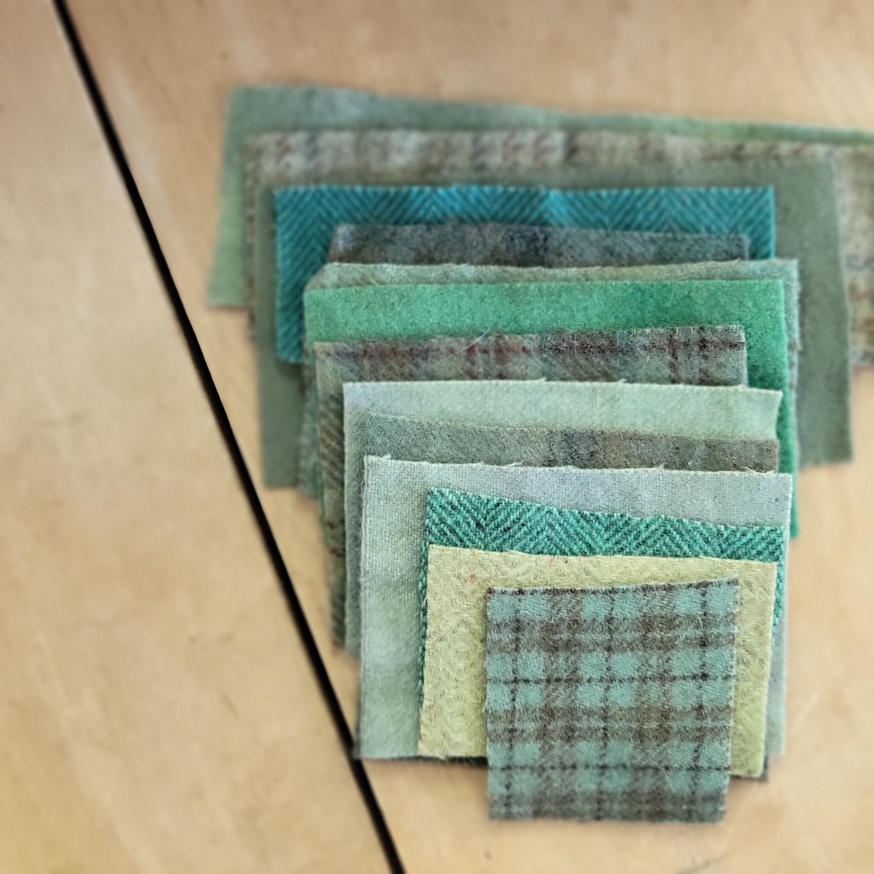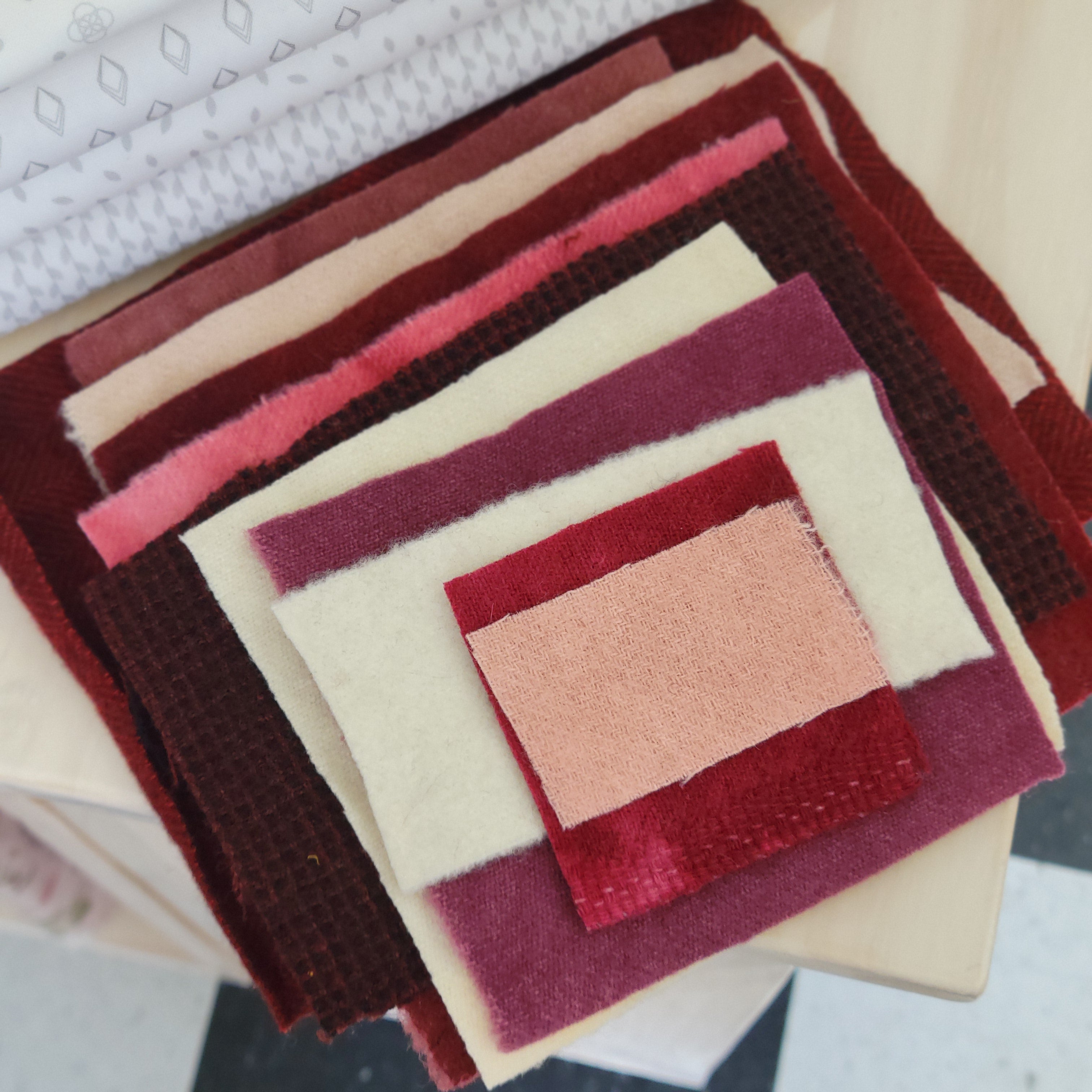 Each color co-ordinated package contains scraps of wool to equal the weight of one fat eighth, cut in a variety of sizes and paired with complimentary pieces.