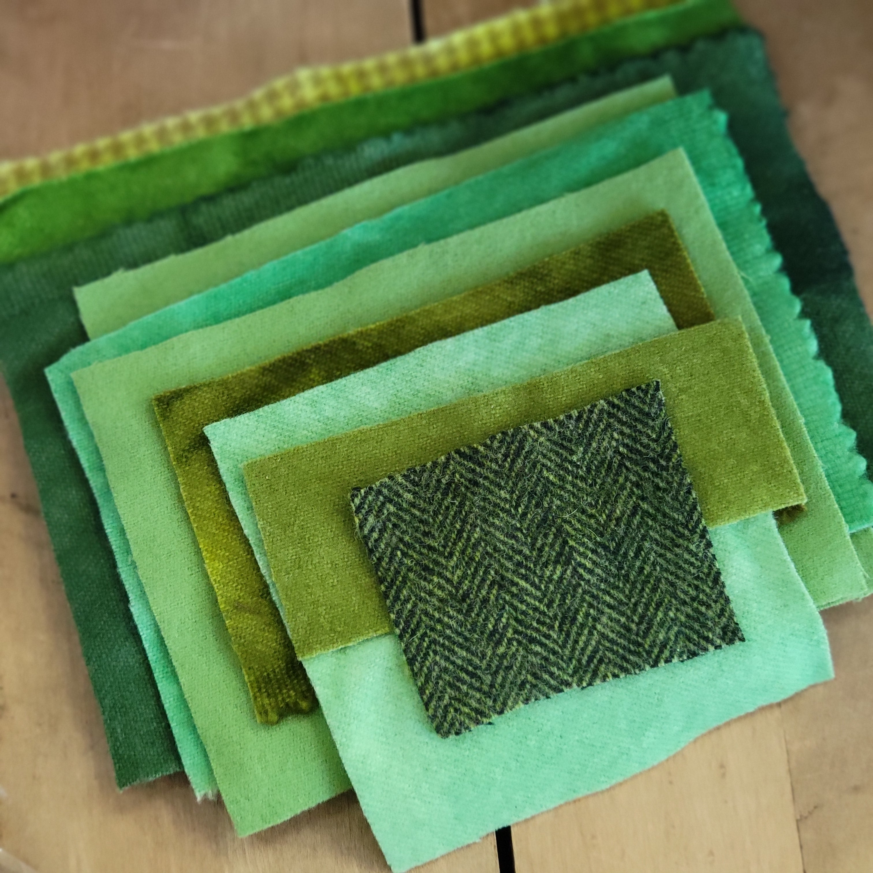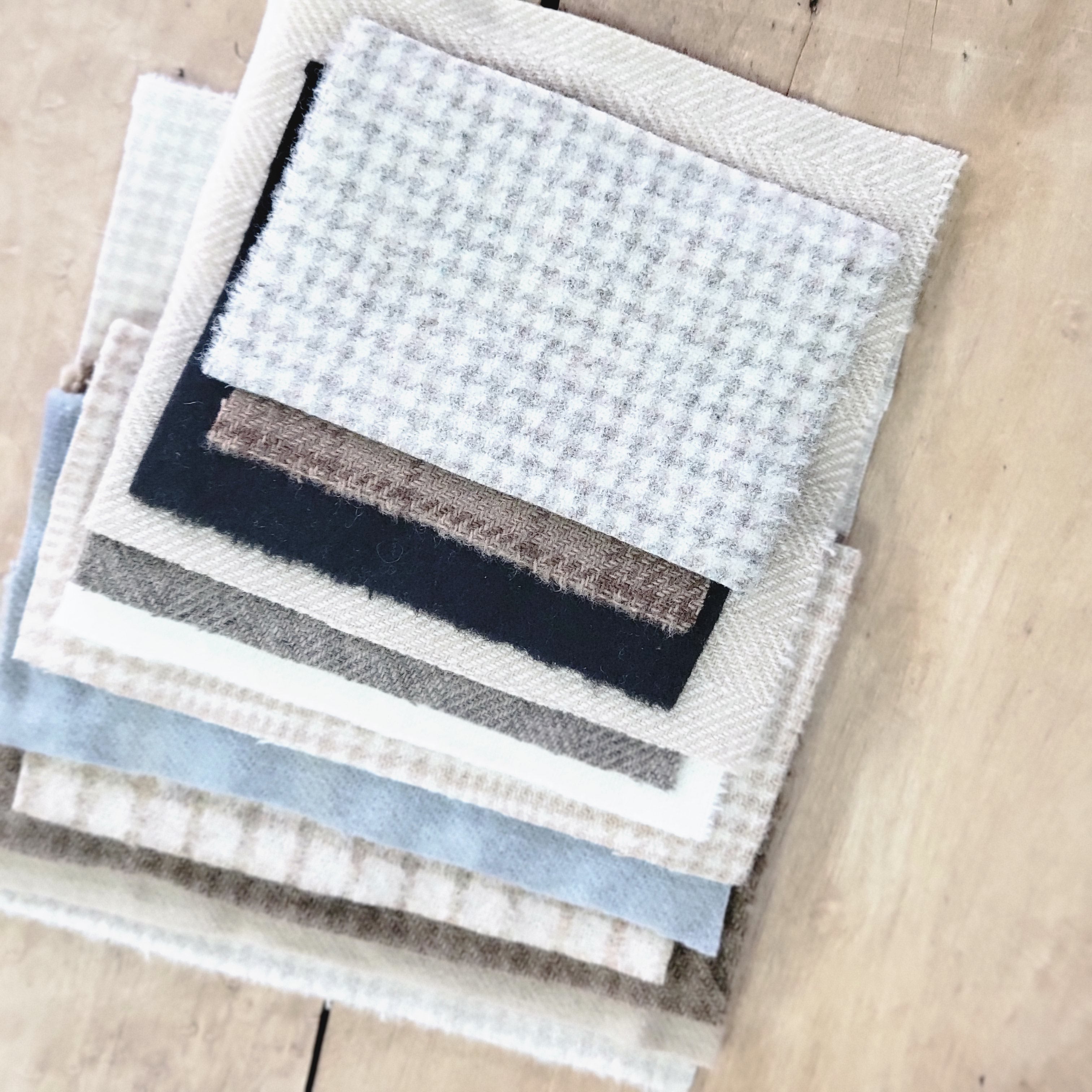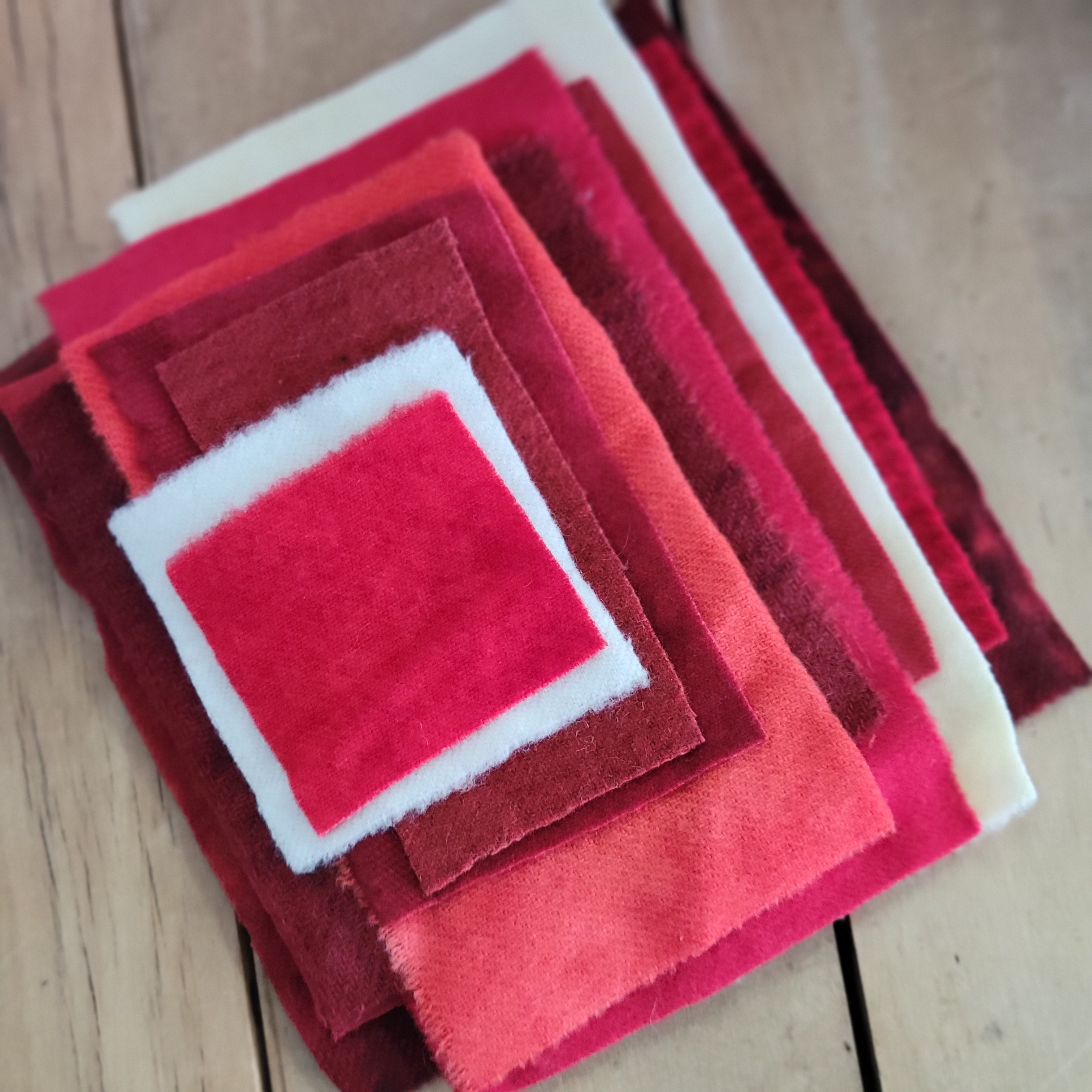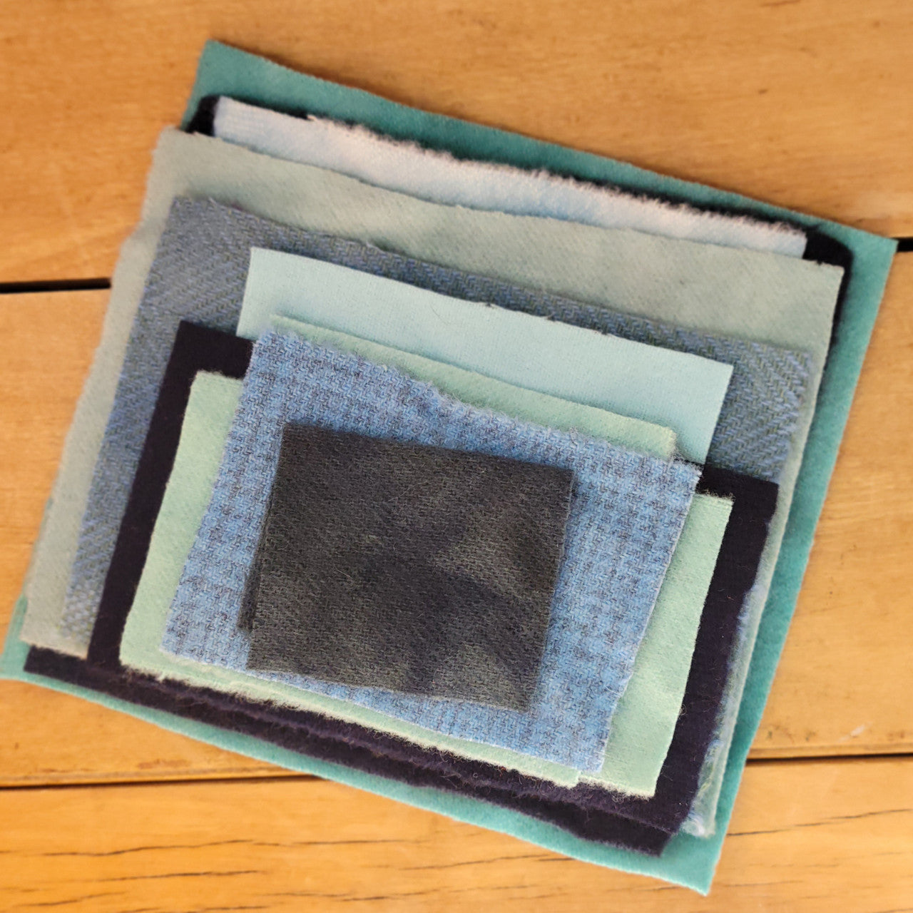 Each color co-ordinated package contains scraps of wool to equal the weight of one fat eighth, cut in a variety of sizes and paired with complimentary pieces.
