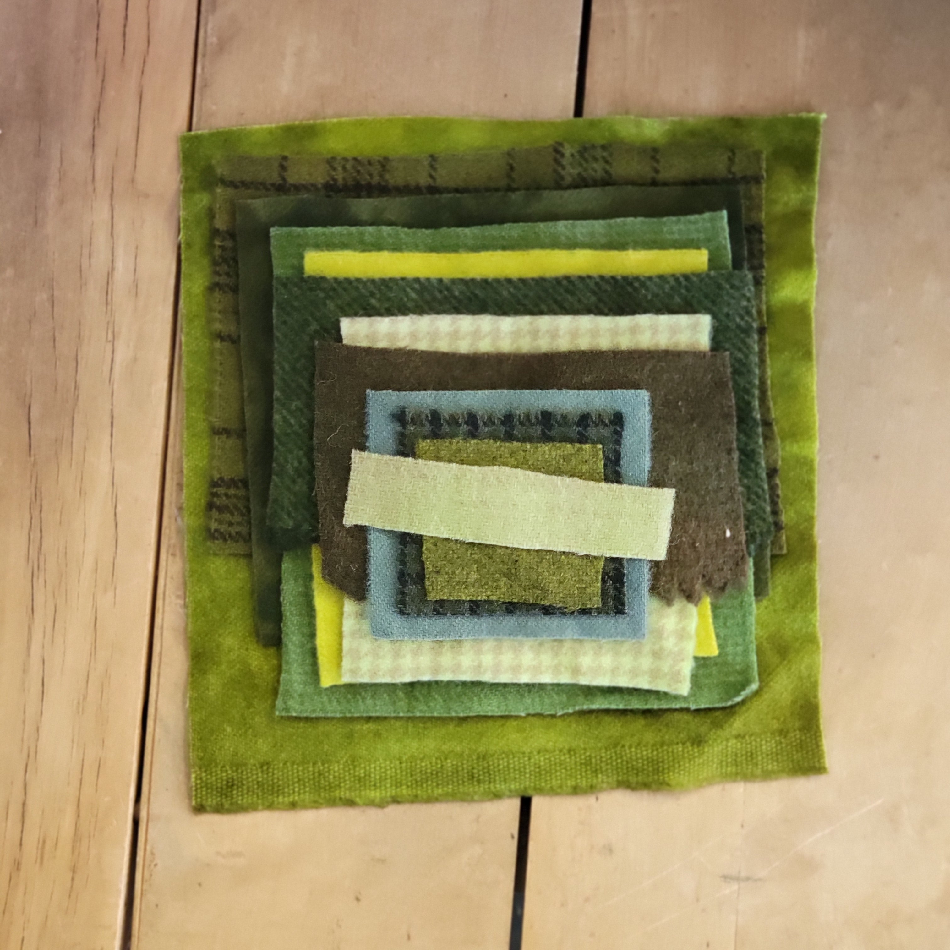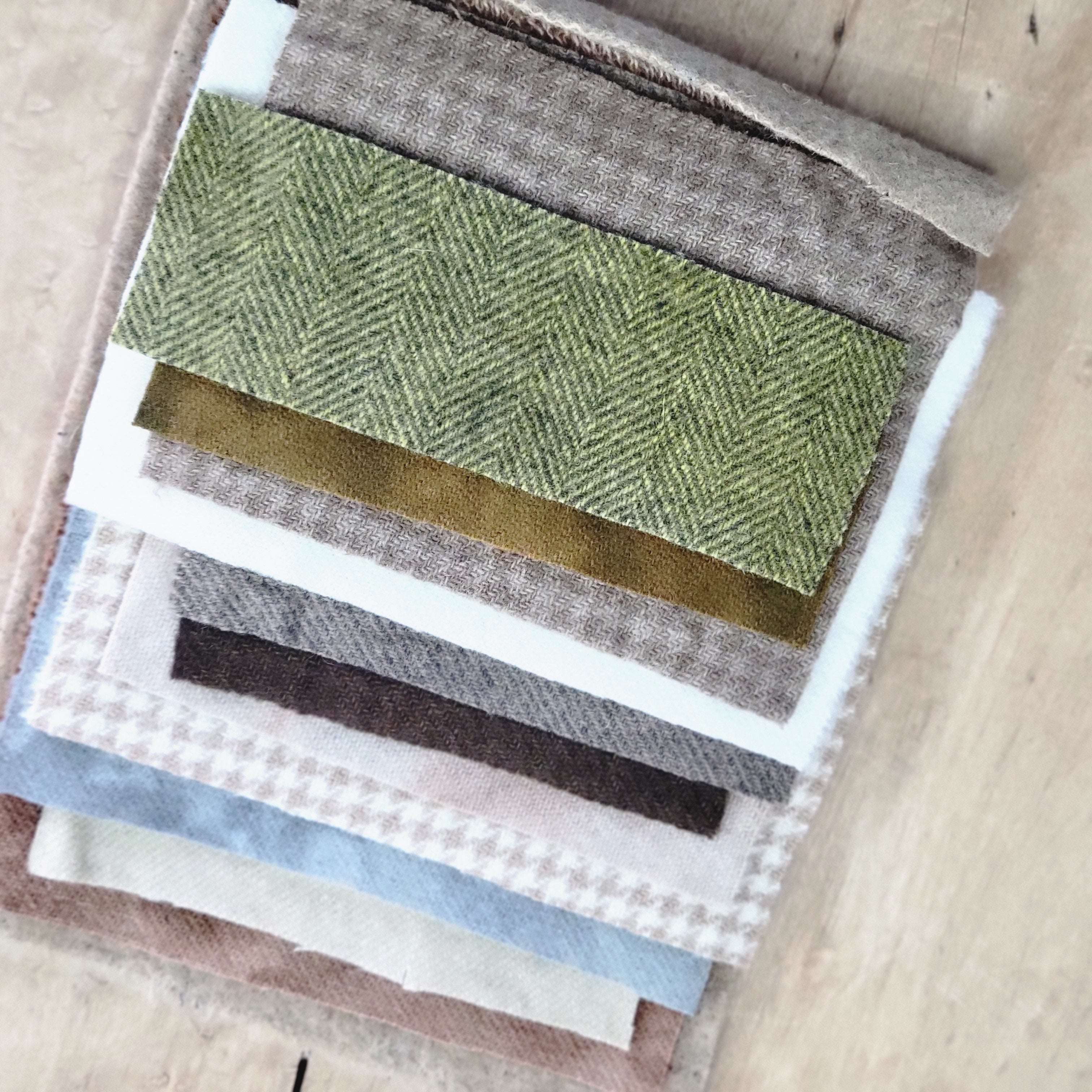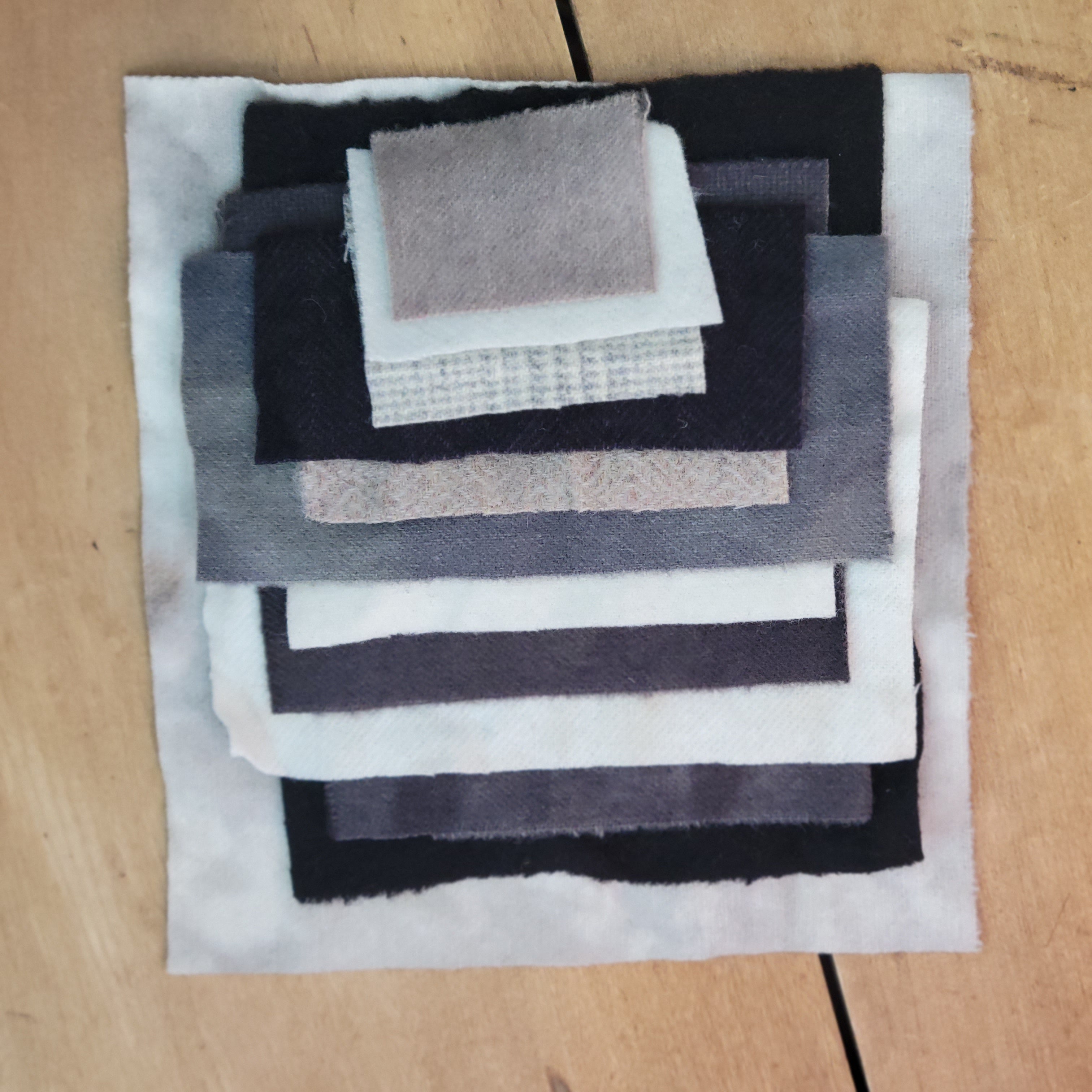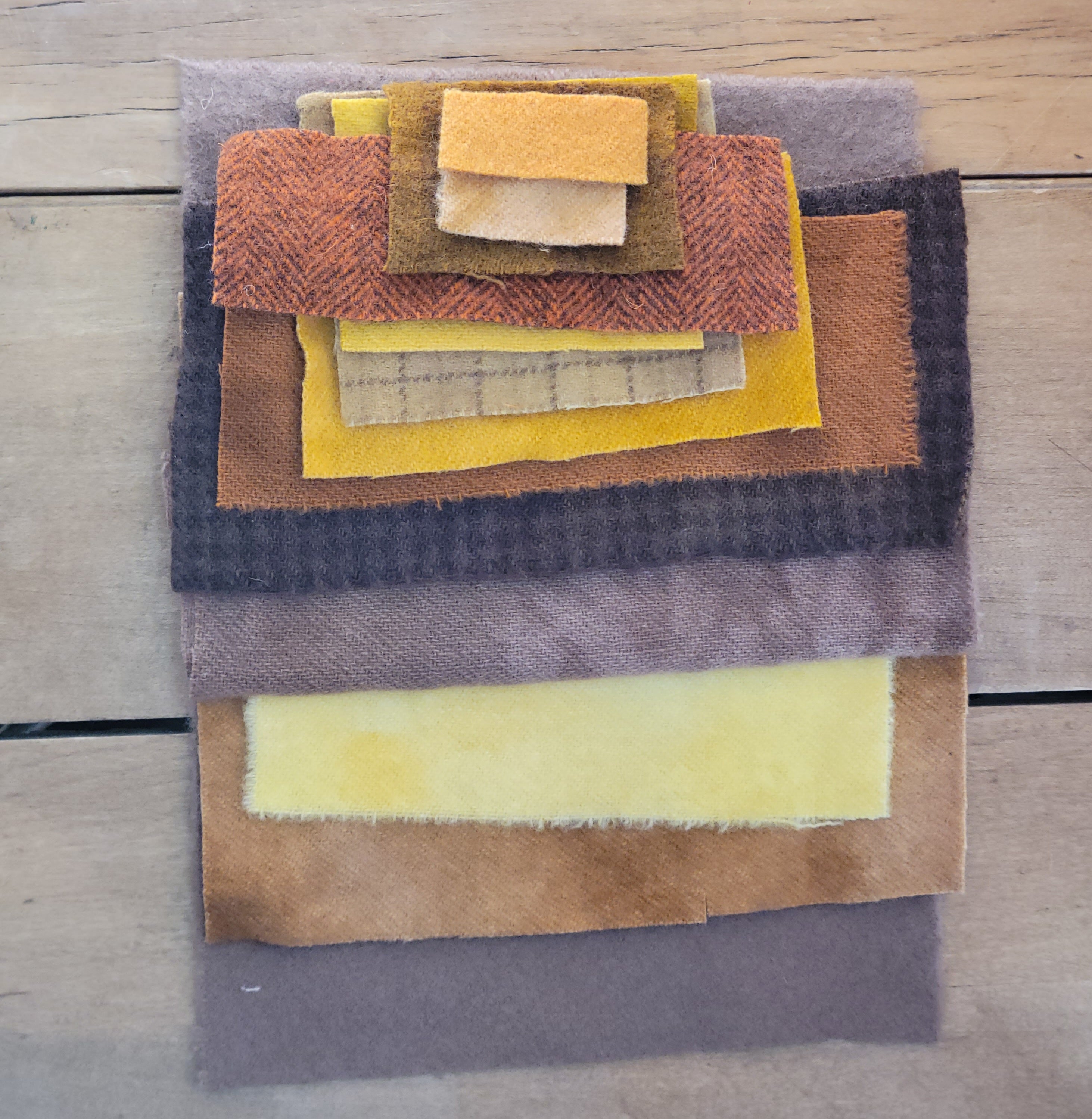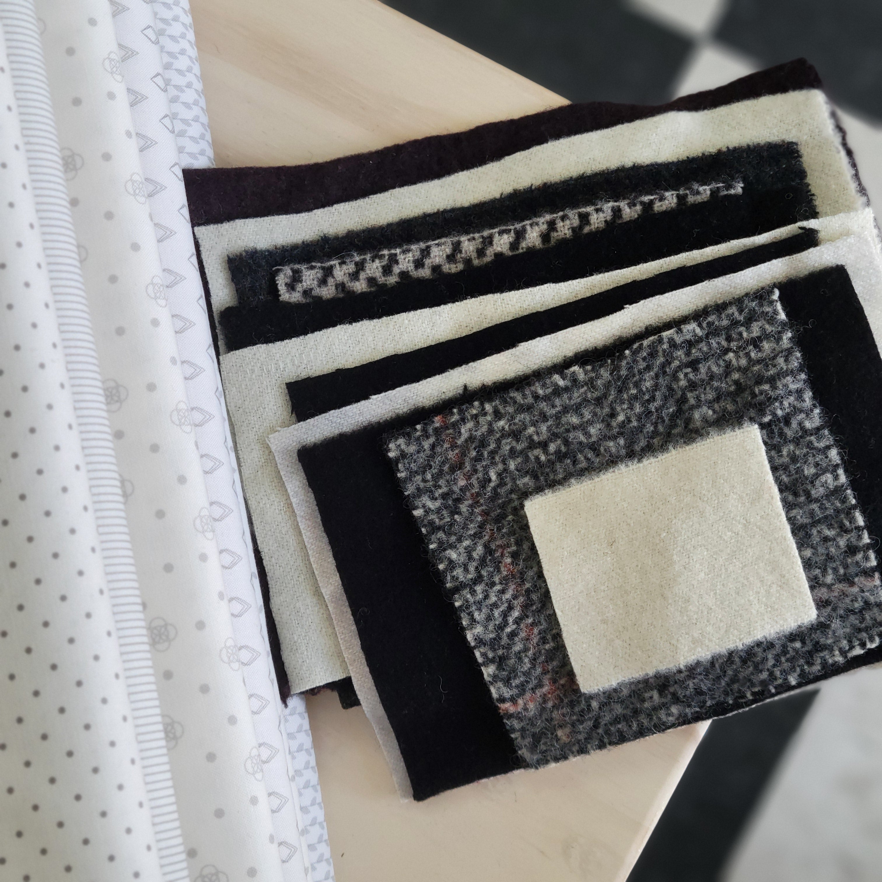 Each color co-ordinated package contains scraps of wool to equal the weight of one fat eighth, cut in a variety of sizes and paired with complimentary pieces.