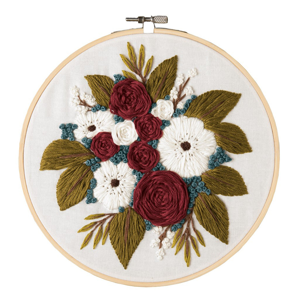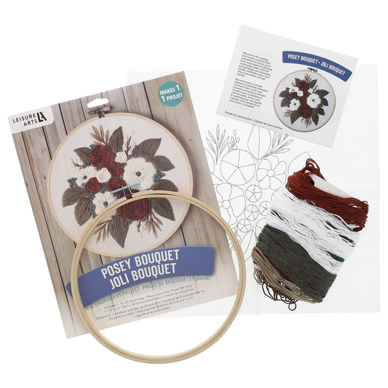 Kit includes: 1 wooden 8" embroidery hoop, 7 shades of embroidery floss, 1 piece of 12"x 12" printed fabric, 1 needle, and instructions. Use the embroidery hoop to keep the fabric taut and then to display your project. Makes 1 design. Colors and contents may vary.