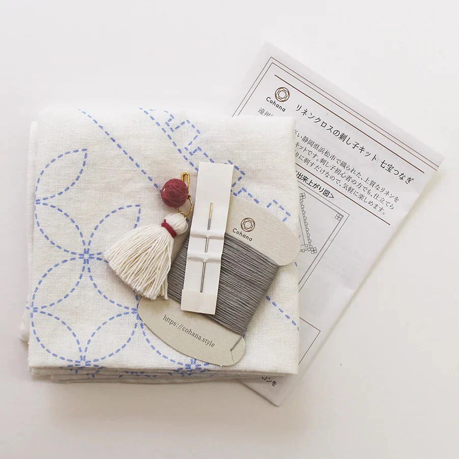 In order to enhance the texture of the natural linen, the Sashiko thread is also carefully selected. Sashiko thread is made of cotton dyed with natural plants. Kit includes a handmade tassel with tiny handmade Temari ball charm. The cloth is 50 cm square, which is a size that can be used in various ways depending on your ideas.