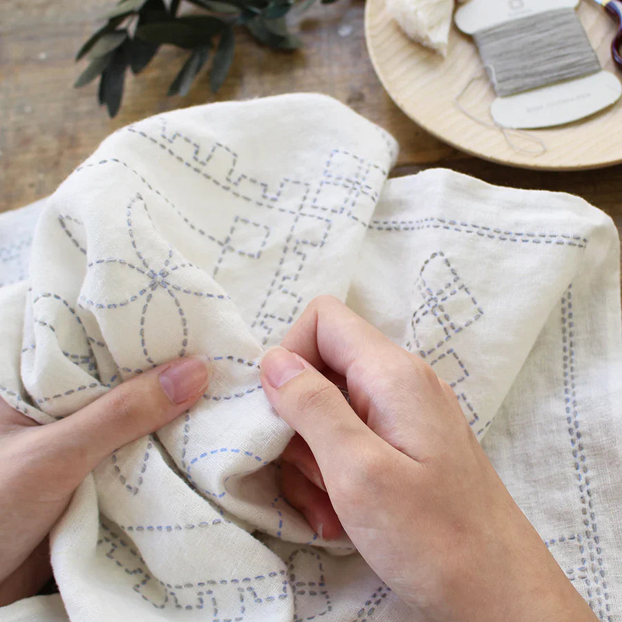 The stitch patterns are printed on the linen cloth with special ink that disappears with water. The Japanese traditional pattern"Shippo Tsunagi" is arranged and used for the design on the linen cloth. The overlapping circles symbolize "happiness," "harmony," and "connections." The design is believed to bring good luck.