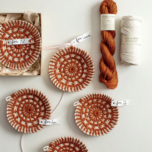 Use beautiful Flax & Twine Daytime Linen Yarn and 3mm Flax Cord to basketweave these adorable jewelry dishes. Use this kit to make a small gift for everyone on your list. Perfect for friends, family, teachers, and service providers!