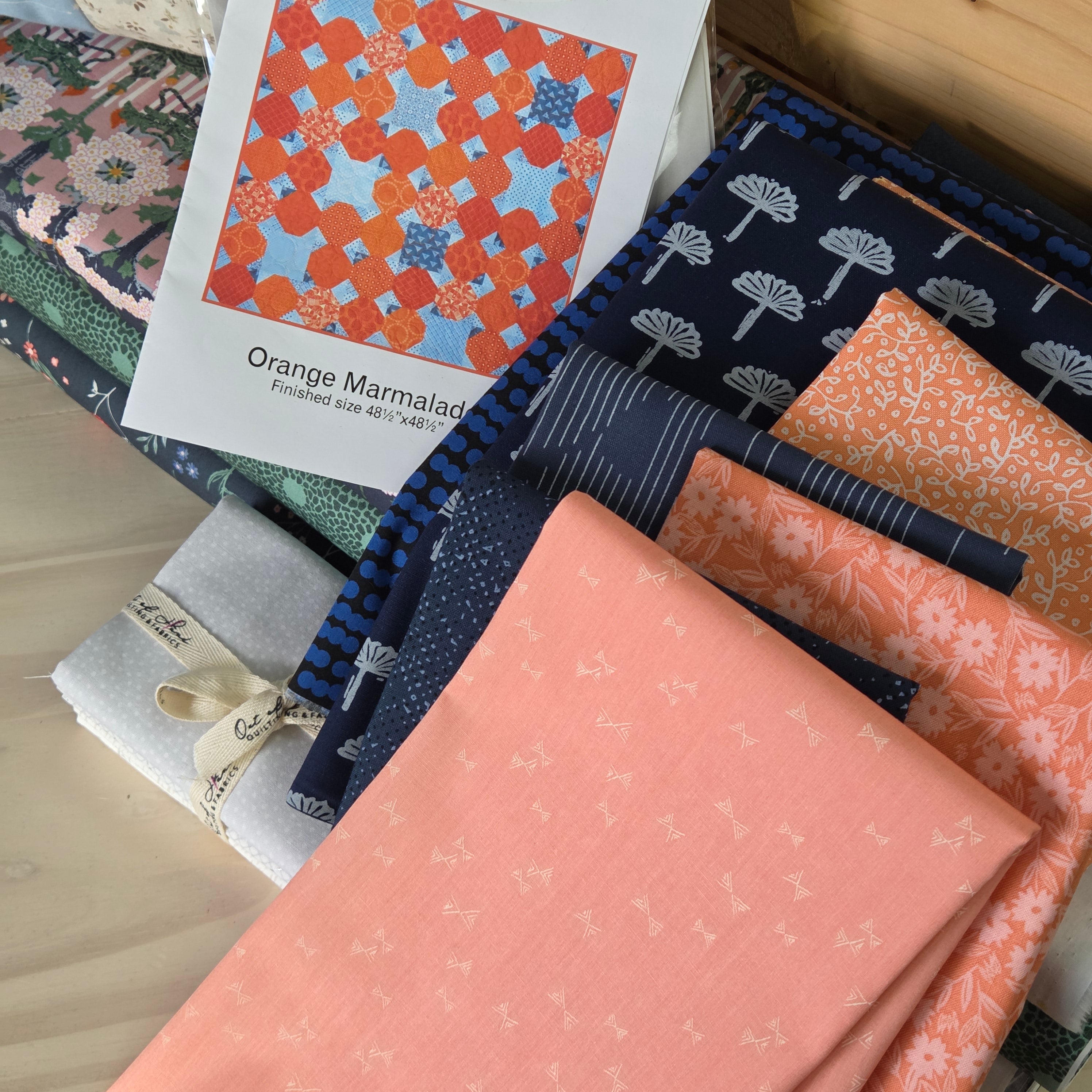 - A playful mix of 100% quilting cotton in Peach & Navy fabrics