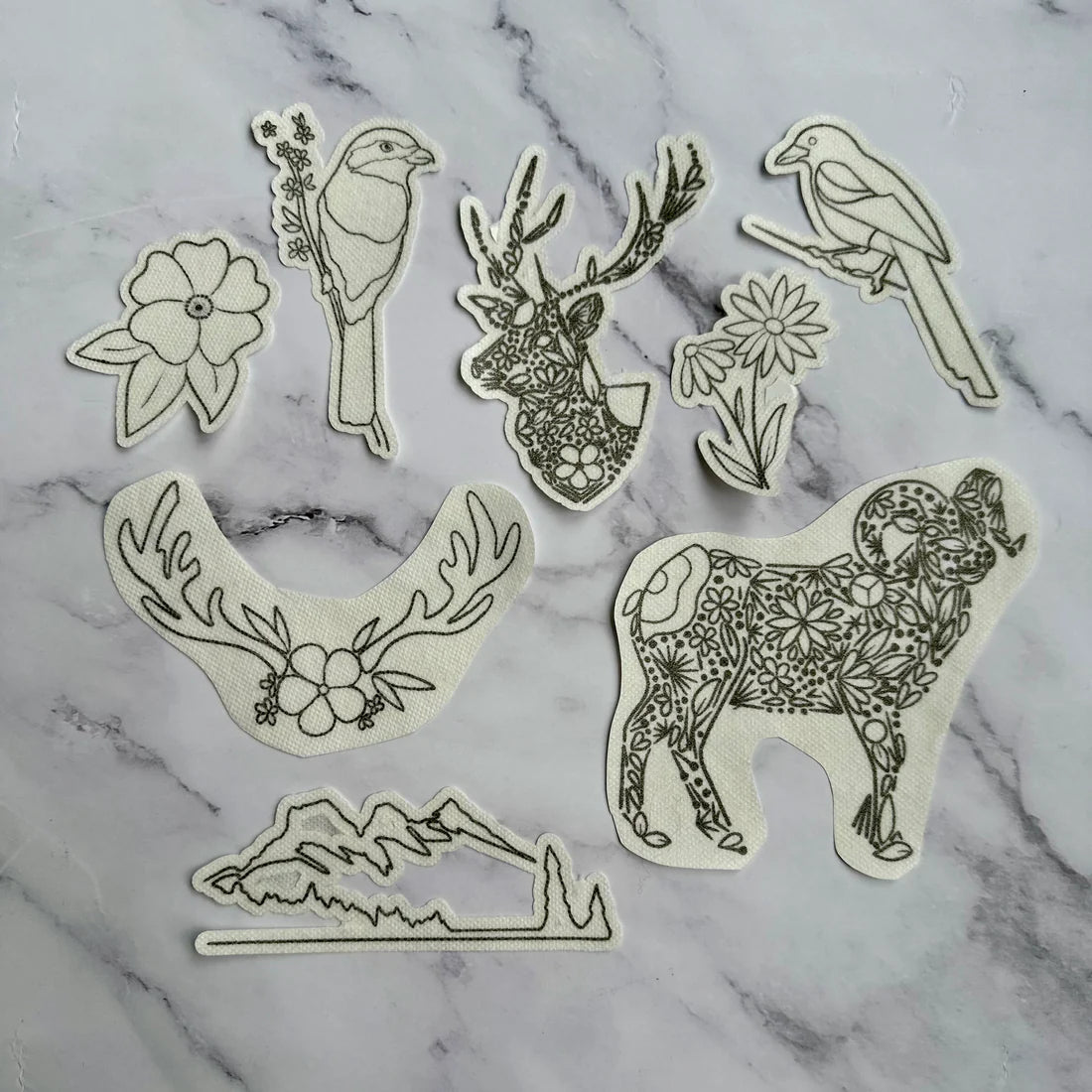 Bring a touch of mountain charm to your makes with a mix of embroidery stitches! This set includes eight pre-printed designs that are ready to go—just peel off the backing, place the stabilizer on your fabric of choice, stitch away, and then rinse it off when you’re done. It feels like magic!