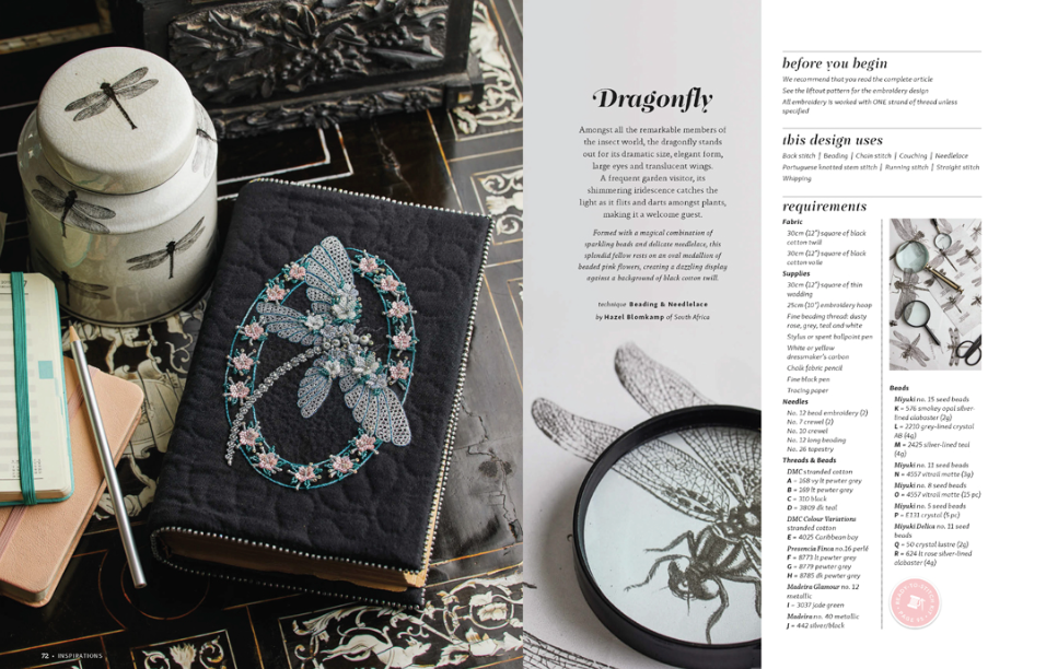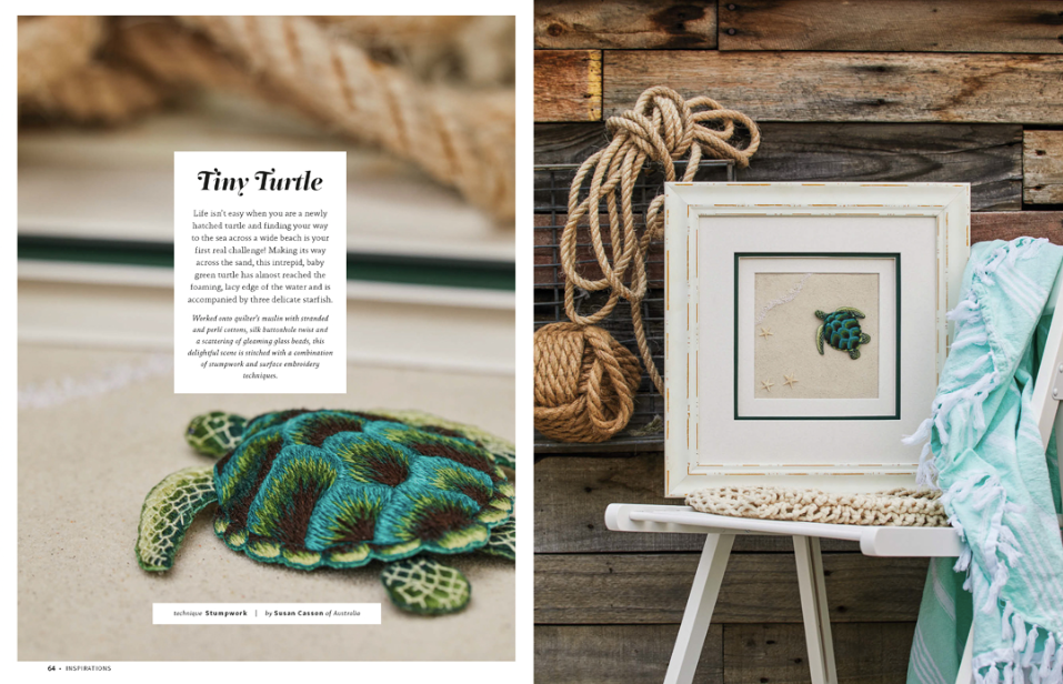 We also bring you Alison Cole’s iconic Australian blossoms in stumpwork, Susan Casson’s enchanting three-dimensional turtle hatchling making its way to the ocean, a beaded dragonfly by Hazel Blomkamp, and welcome new contributor Laurence Lieblich of Canevas Folies.