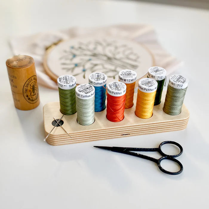 This Spool Rack holds 8 spools (can fit Sue Spargo / Aurifil Small spools, etc) or any other brand with a similar 2cm diameter plastic base. The ultra-strong magnet will keep your needles or even your scissors in place and at-the-ready.