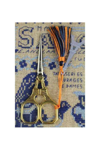 This pair of scissors is covered with a sky blue Eiffel Tower charm, specially made to go with it. The orange and blue pompom, the favorite colors of the Sajou house, was made in a trimmings workshop in the Saint-Etienne region.