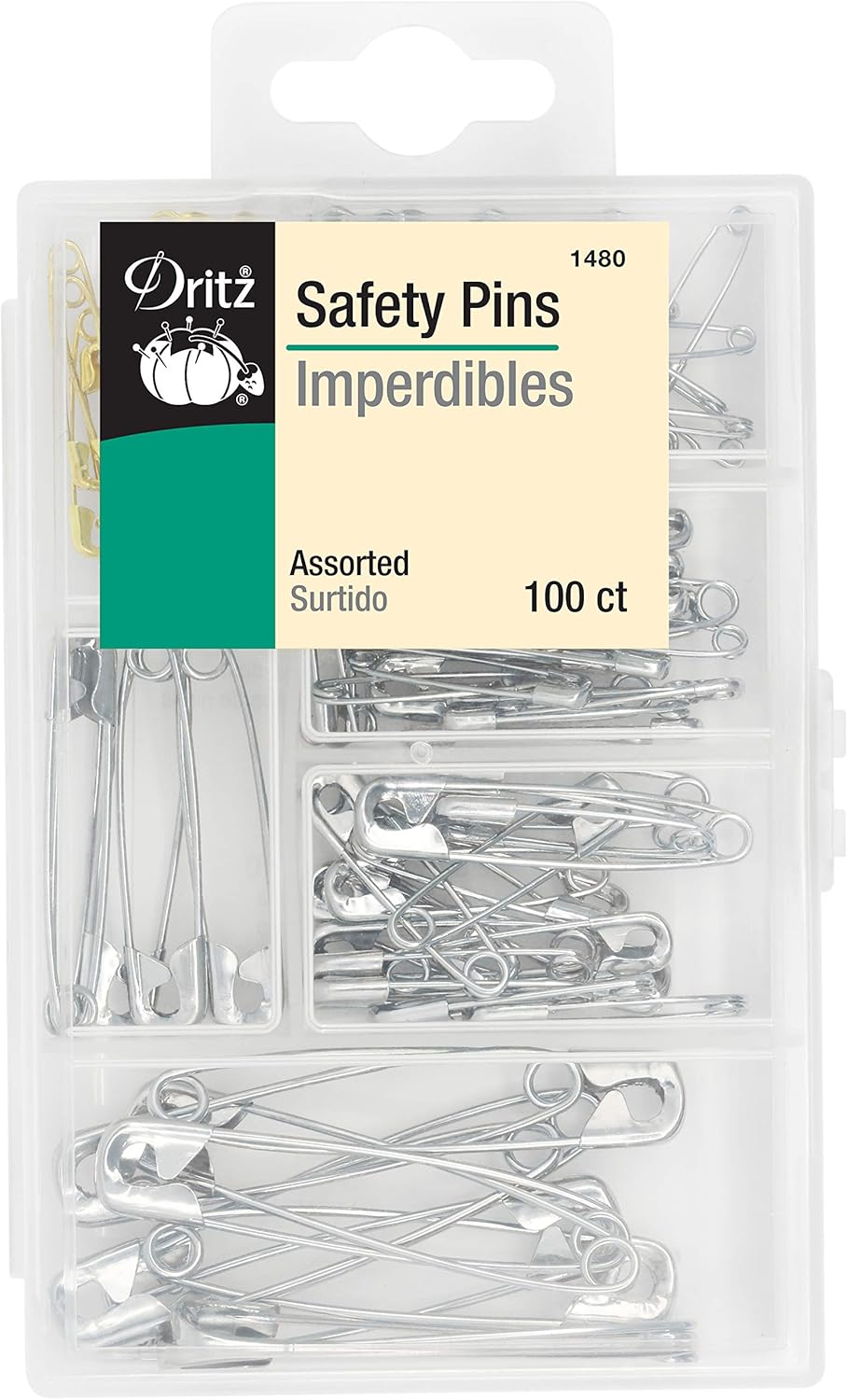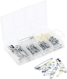 100 Safety Pins in 5 assorted sizes: 00, 0, 1, 2, and 3. Nickel plated steel and brass. Packaged in a storage box with 6 compartments, secure latch and built in hanger.
