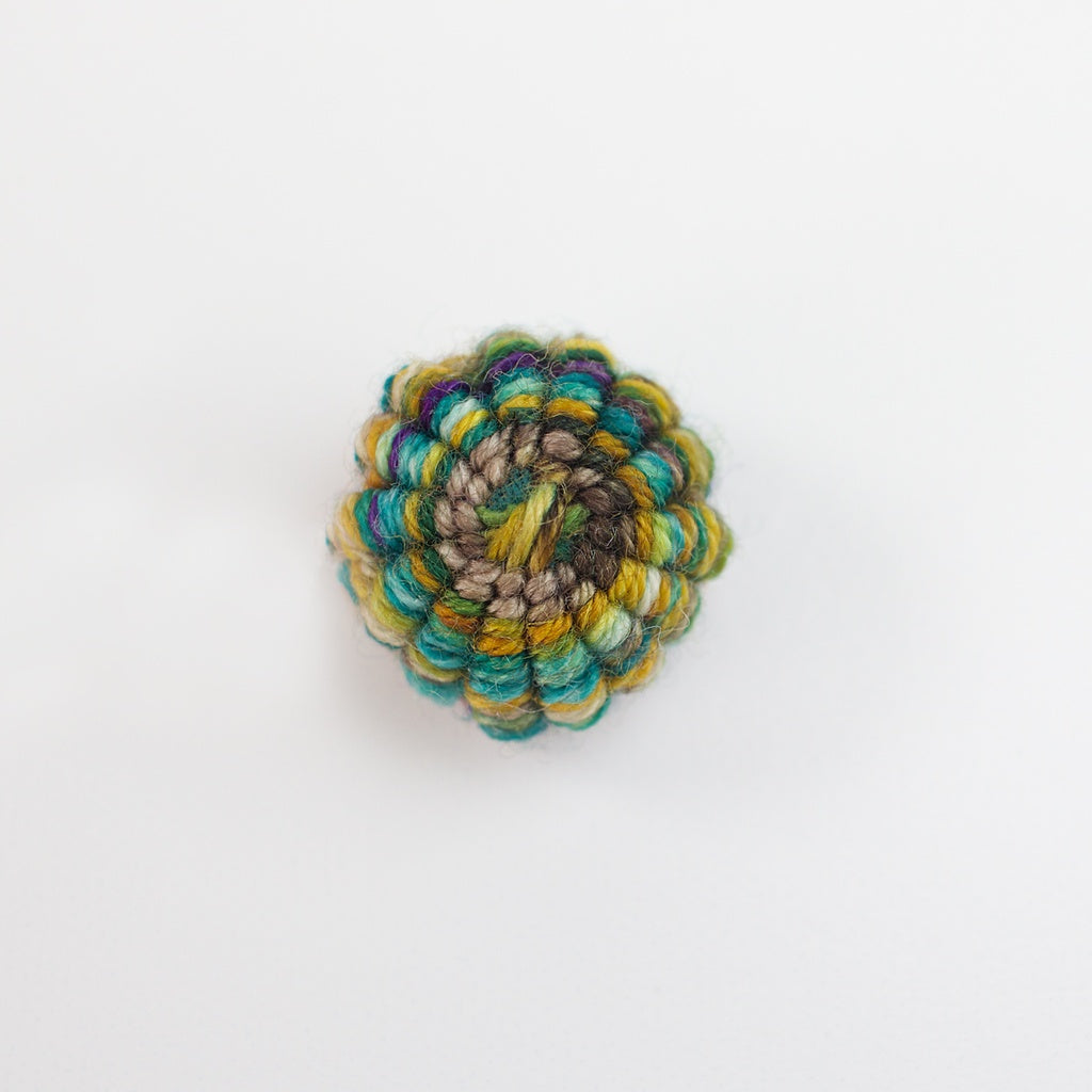Yorkshire buttons are very similar in technique to the traditional Dorset buttons. However, they are made on a little loom, and then stuffed to create a ball or flat shape. They can be made using leftover wool and thread from projects – in fact they often work best with thicker thread. The resulting buttons are very tactile, and lots of fun!