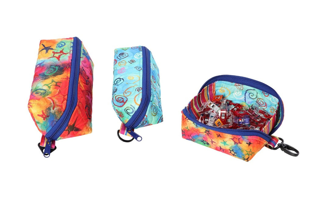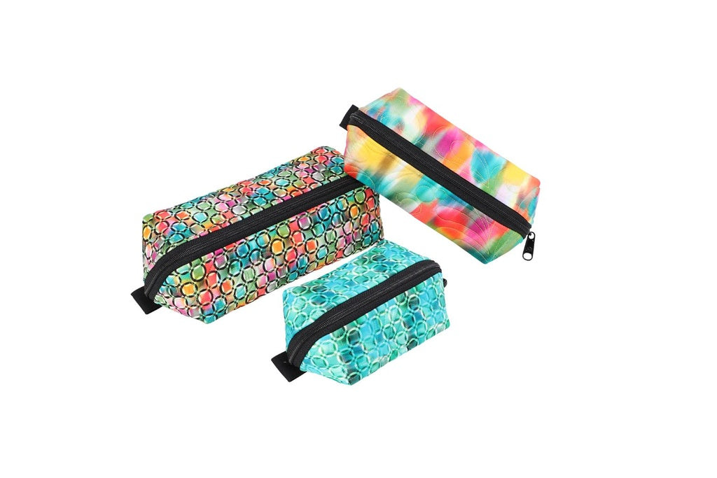 Multipurpose zippered pouches in three sizes open to create shallow trays that provide great visibility and easy access to contents.