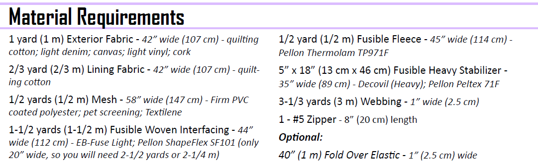 The pattern was designed for quilting cotton, light canvas, or light denim with plastic mesh and is designed to be made on a domestic sewing machine!