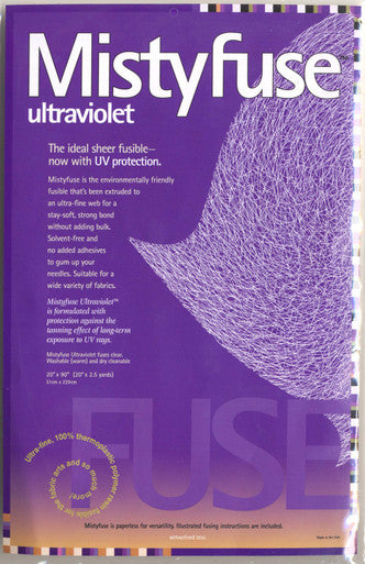 Misty Fuse Ultraviolet is specially formulated with an effective retardant to protect against the tanning effect of UV rays - without sacrificing any of the inherent Misty Fuse qualities you expect and trust. Misty Fuse Ultraviolet is white and fuses clear. 20 inches wide. Environmentally friendly product. Ultra strong, stays soft. No bulk. Solvent free, no added adhesives. Suitable for wide variety of materials.