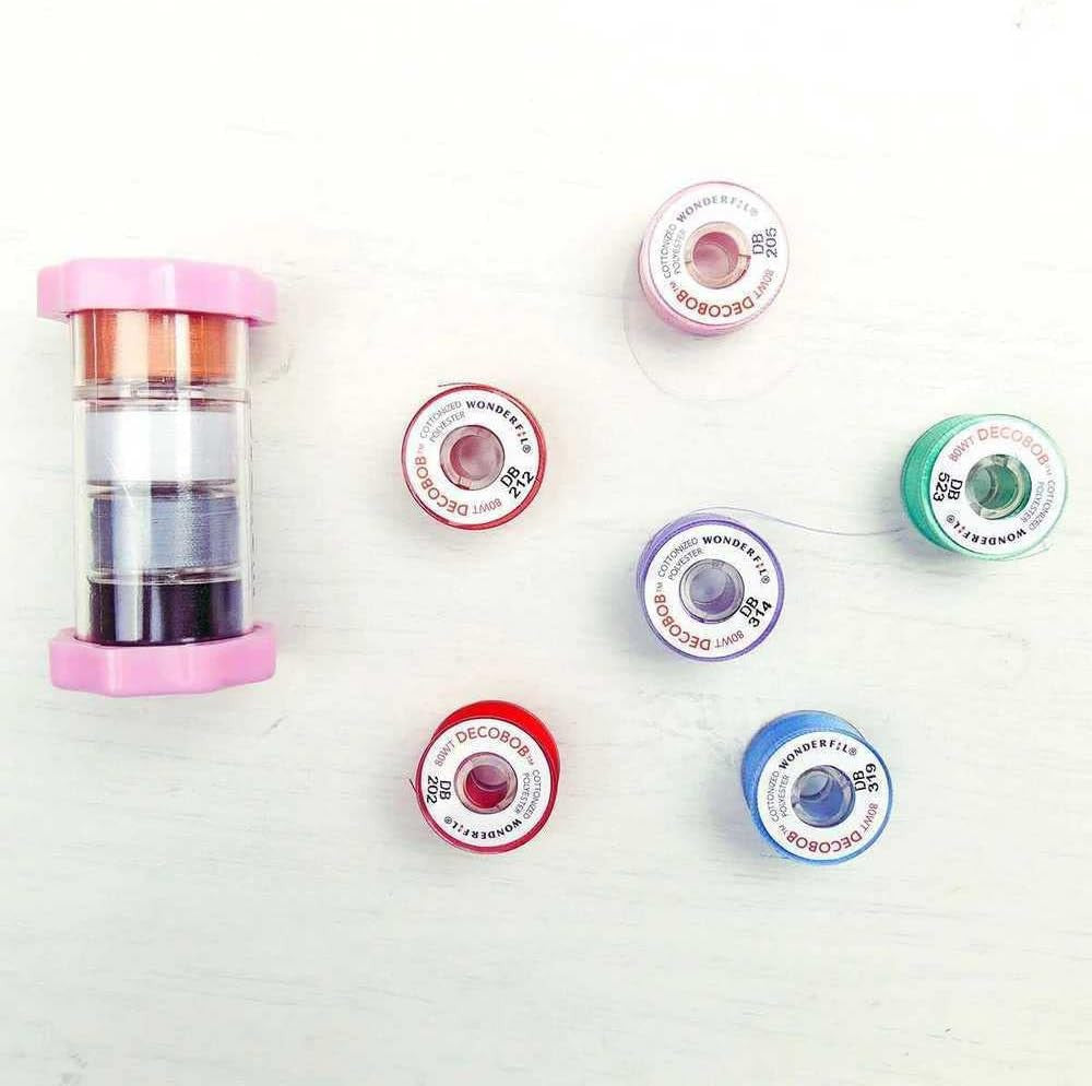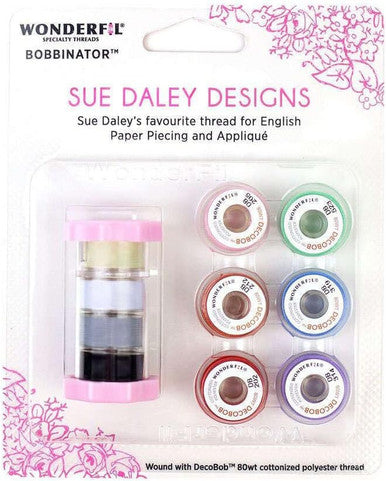 A new collection of thread packs and WonderFil® products is now available in collaboration with Sue Daley, an international teacher and designer from Australia. Her packs include sets of 6 or 10 mini spools of DecoBob™ 80wt cottonized polyester thread, as well as a Sue Daley branded Bobbinator™ device. Perfect for hand stitching, appliqué, and English paper piecing, these packs make it easy and convenient to get started on your next project.