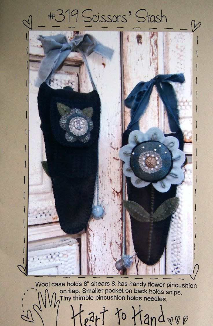 This is a wool applique sewing and embroidery pattern packet only. It is not a kit or a completed project. The pattern is from 2013 by Kathi Campbell and Heart To Hand. It comes with the pattern, instructions and supply list on the back. It has some shelf wear but overall it is in good condition. "Wool case holds 8-inch shears and has handy flower pincushion on flap. Smaller pocket on back holds snips. Tiny thimble pincushion holds needles