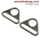 These flat triangle rings have two holes and fit a 1 1/2" (38 mm) bag strap. Clip your swivel hook right into the top hole. No more bag rings sliding and twisting in your strap tabs, and they look good too!
