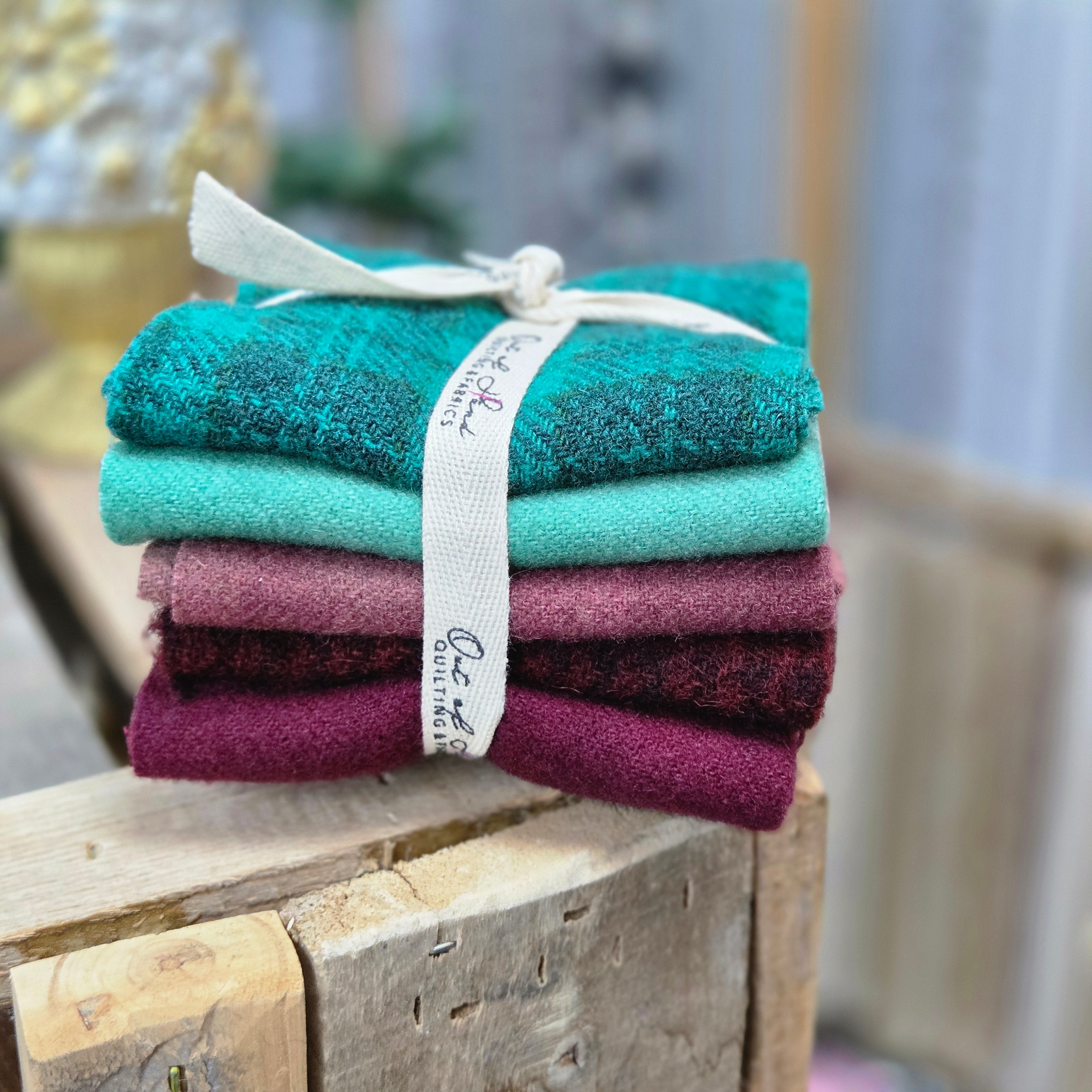 These bundles are ideal for stash building, with each bundle containing 5 pieces, shop cut at approx. 12"x7" (or cut as Fat 16ths). Due to the felted nature of textured and hand-dyed wools, some pieces may vary in size.