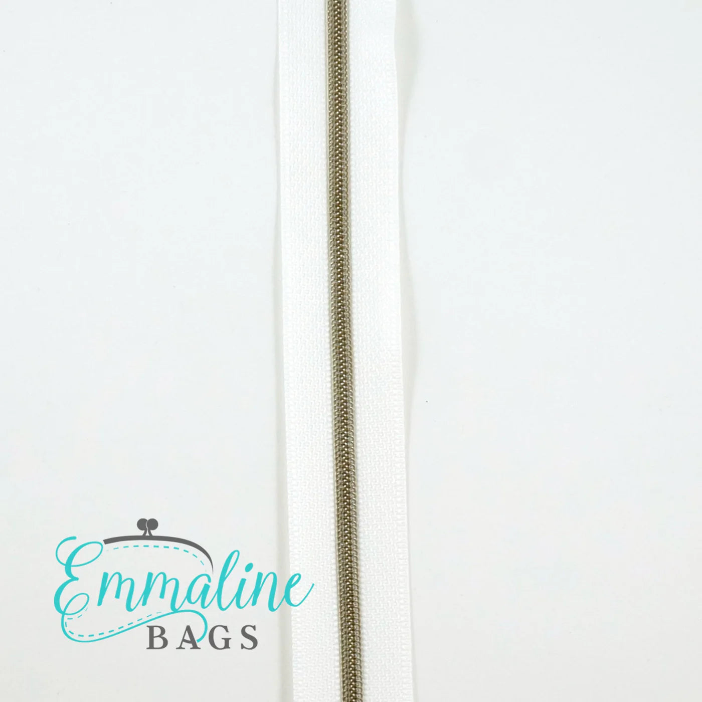 Emmaline #3 Zipper By The Yard - 3 Yard Length: White/Antique Brass
