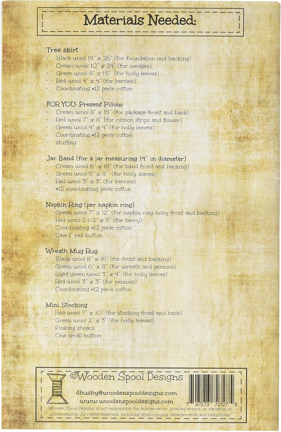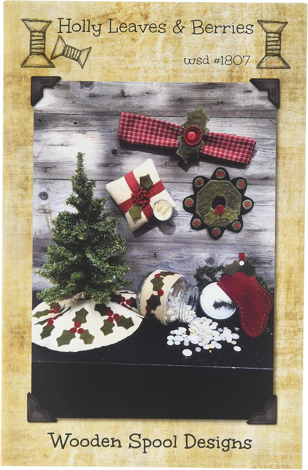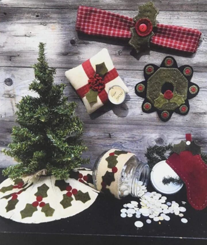 Various patterns included: Tree skirt, Present Pillow, Jar Band, Napkin Rings, Wreath Mug Rug and Mini Stocking