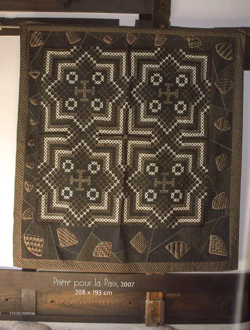 Etsuko Ishitobi won the Grand Prix at the 2012 Tokyo International Great Quilt Festival. She loves antique fabrics, indigos in particular, reusing them to create works of art that are impressive both in design and creativity.