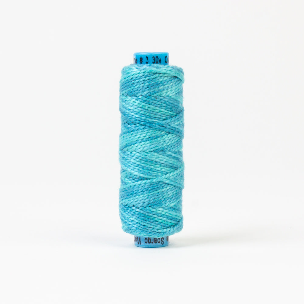 This gorgeous 3wt, random dyed contrasting variegates, 2-ply 100% long staple Egyptian cotton thread is double-gassed and mercerized, resulting in a wonderfully smooth and lustrous surface that allows the thread to glide beautifully through all types of fabrics and fibres. The thread’s tight twist creates beautifully firm stitche