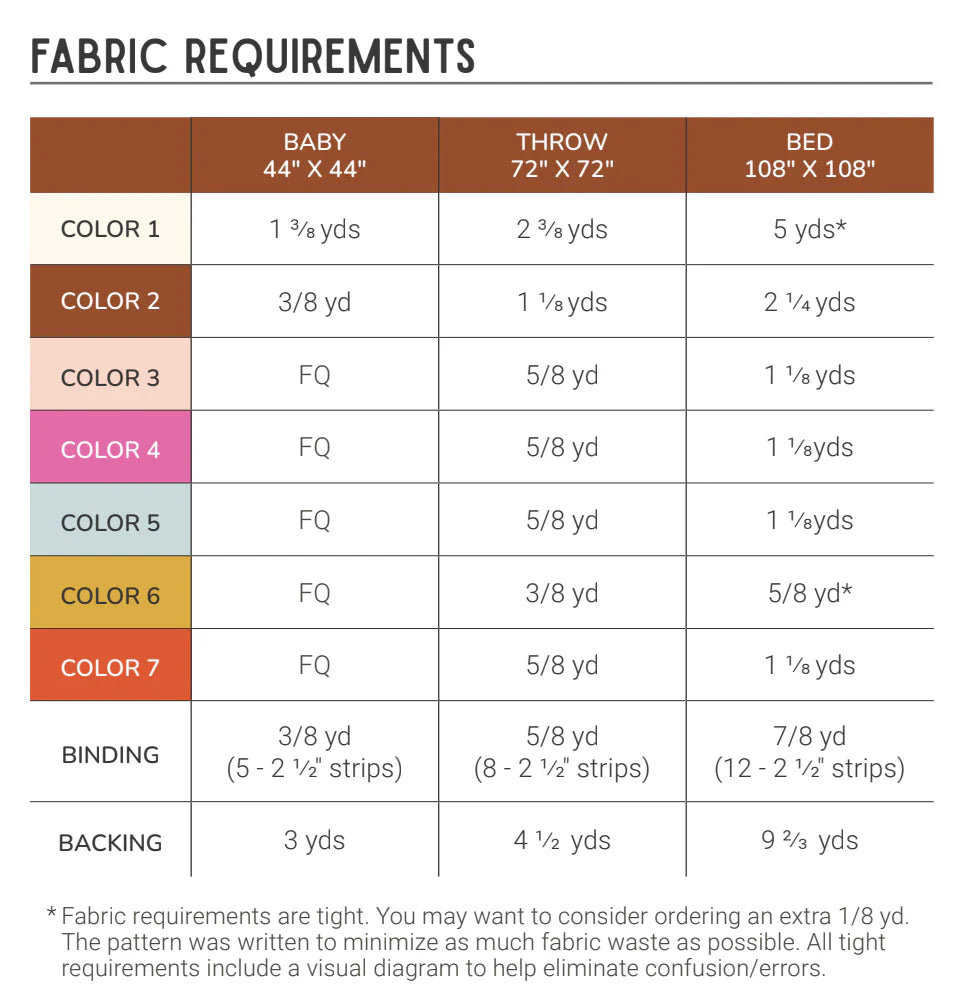 This pattern is rated for the intermediate sewer and assumes that the quilter understands basic quilting knowledge and can keep a consistent 1/4" seam allowance.