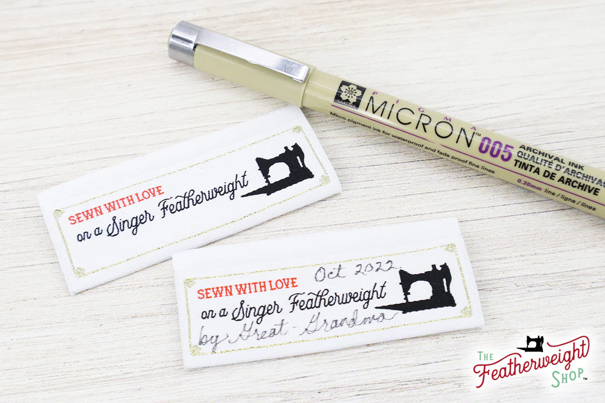 Use simply as it is or personalize it with your signature, but let everyone know your quilt or apparel was sewn on your Featherweight! Get this sweet set of 10 sew-in tags proudly telling everyone that your project was Sewn with Love on a Singer Featherweight.