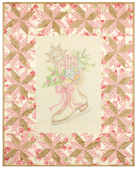 Vintage ice skates filled with glittering ornaments and fir boughs. Its sweet colors could also be worked in rich Christmas brights for a totally different look! Sparkle floss is used liberally to add that holiday glow!